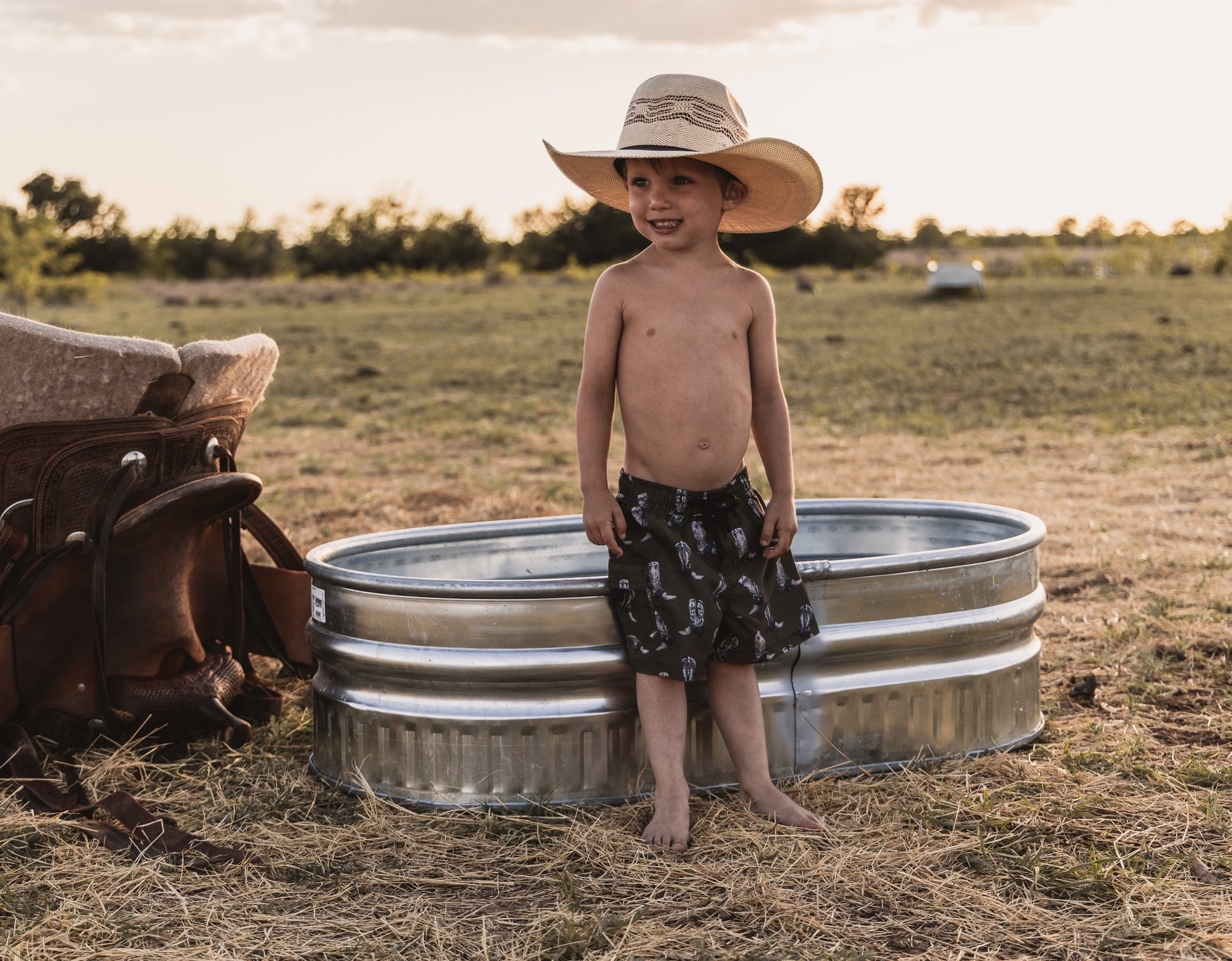 The coolest, high quality western swim trunks out there. Great fit, great material, side pocket, and mesh liner. Elastic waist but they also have a working drawstring. They're just amazing!