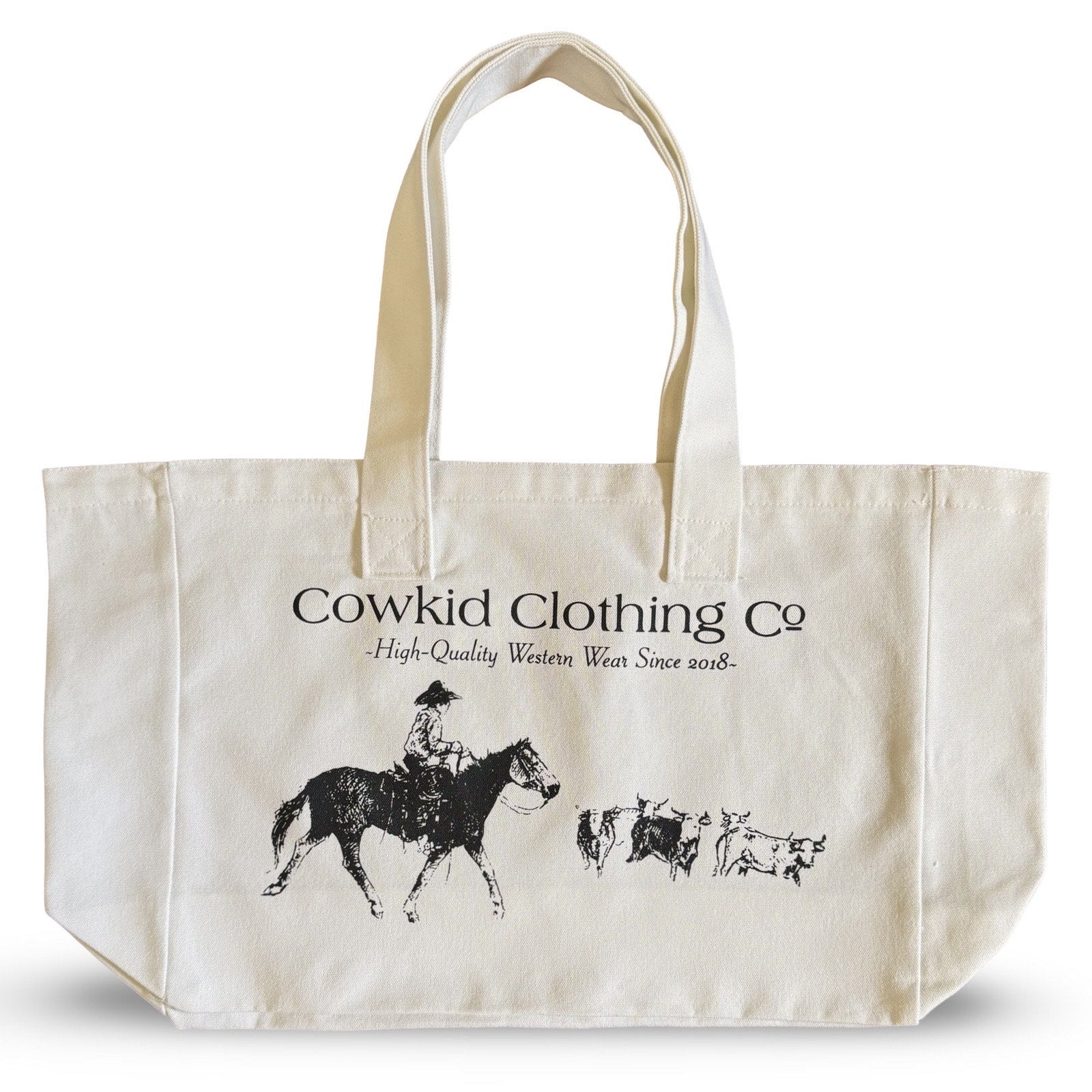 This sturdy, natural canvas tote features original western artwork and the Cowkid Clothing Co. logo—celebrating high-quality western wear since 2018. With reinforced handles and a spacious interior, it’s perfect for hauling your daily essentials, gear, or groceries.