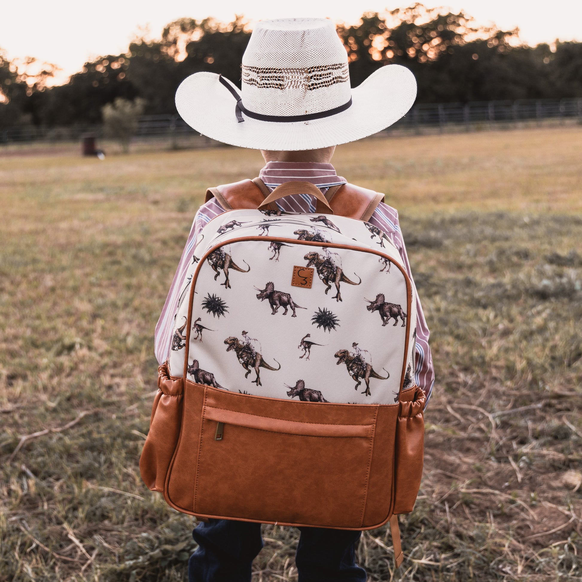 Classy, western full size backpack for age 4 up to adult. Perfect for pre-k to highschool or use it as a beautiful diaper bag. Two side pockets that fit small-large water bottles. Open back pocket and zippered front pocket to keep you organized!