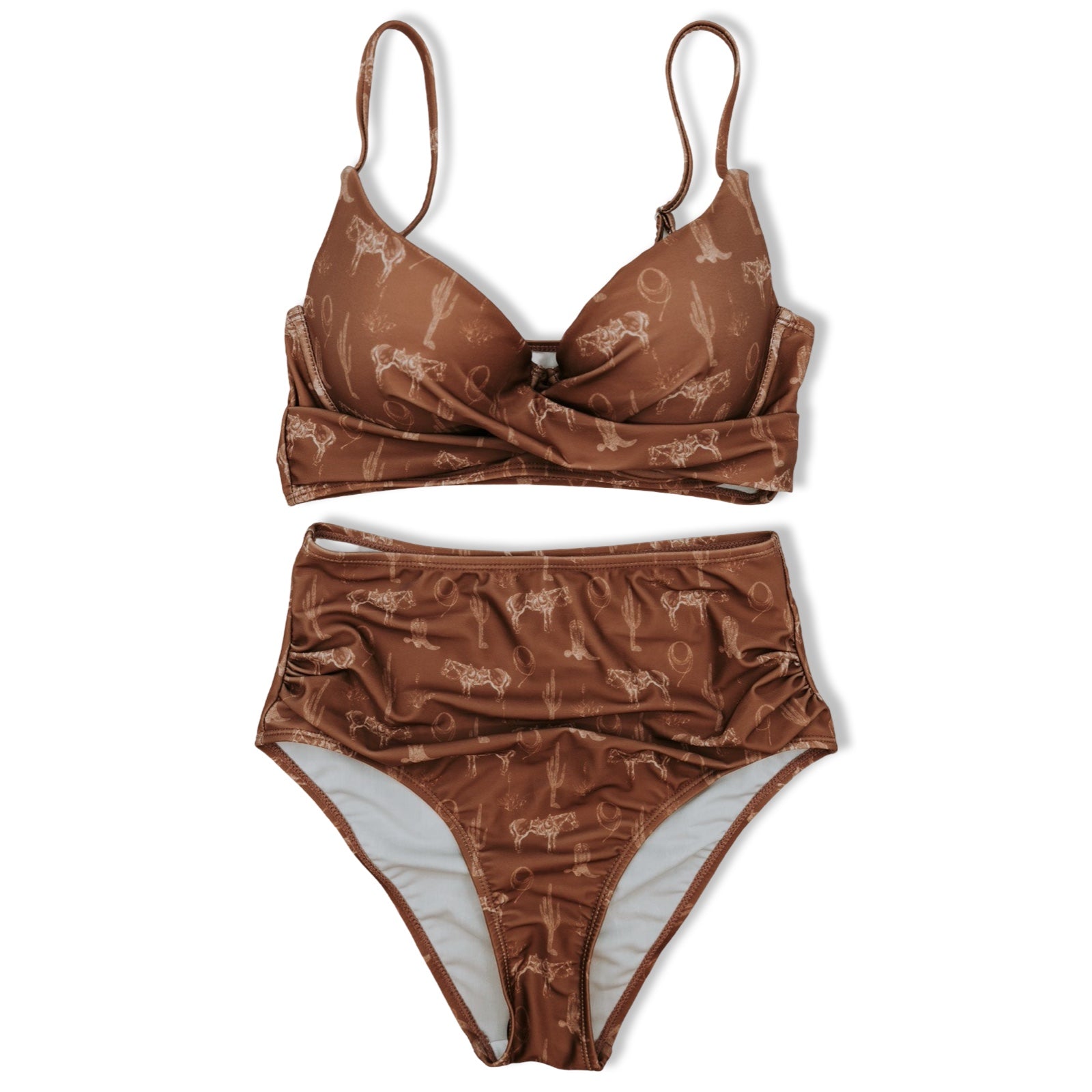 The cutest, high quality western swimsuits out there. Great fit, great material, formed push up cups with underwire. Sewn in padding you won't be searching for! They're just amazing and beautiful! Not too cheeky for a little more bum coverage.