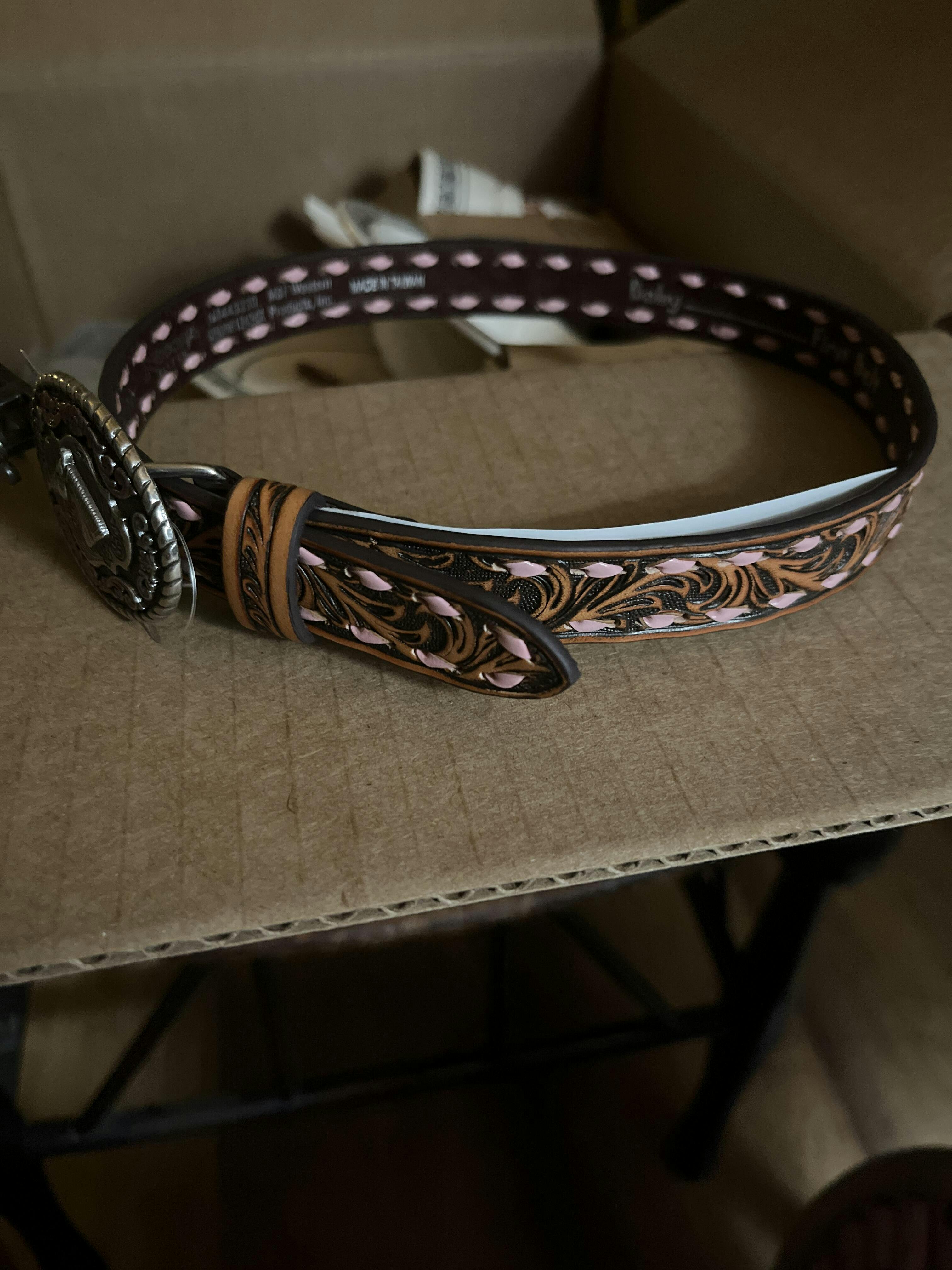 Beautiful 1" leather floral tooled belt. Double lined and includes a silver buckle and a leather keeper.