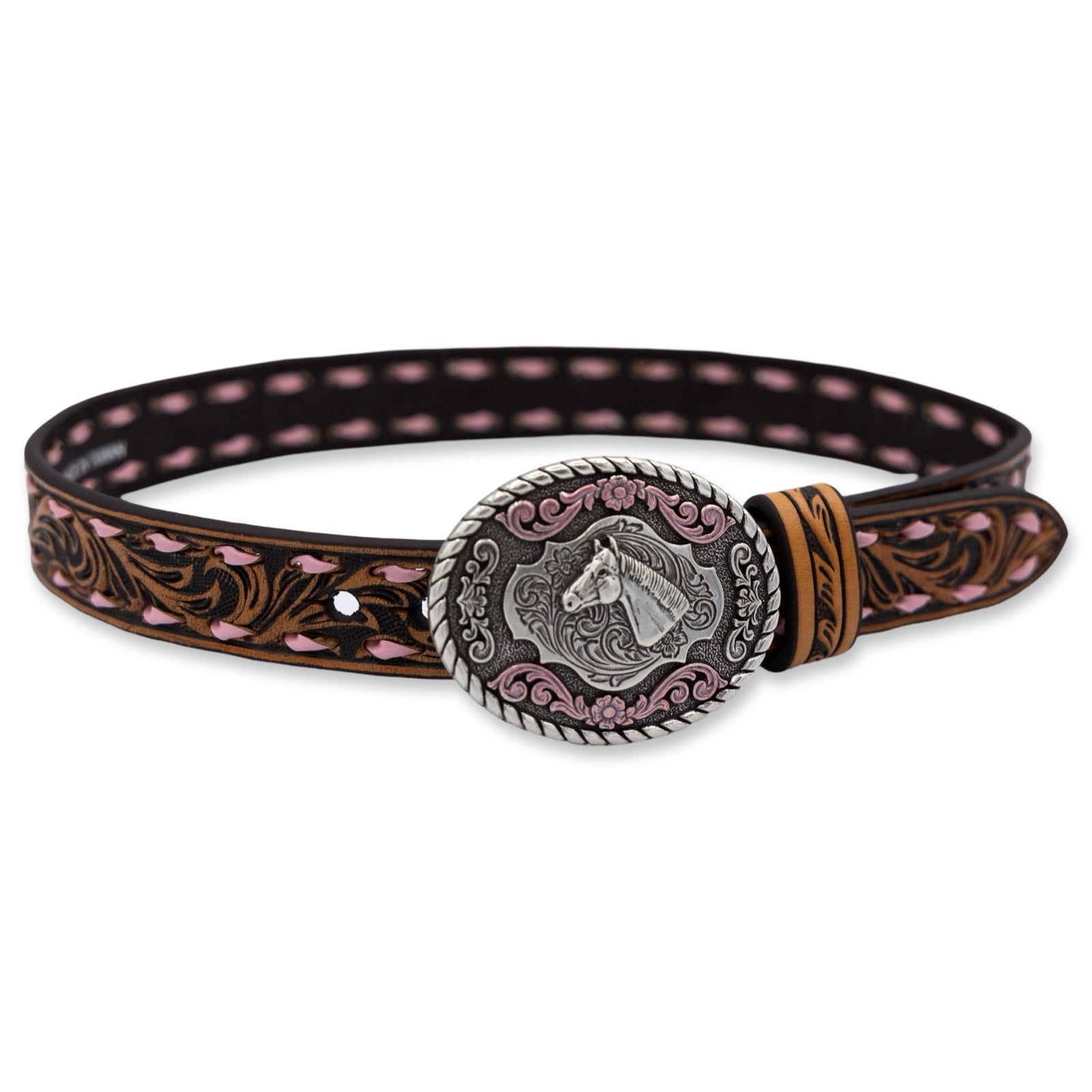 Floral Tooled Pink Buckstitch Baby Belt with Buckle