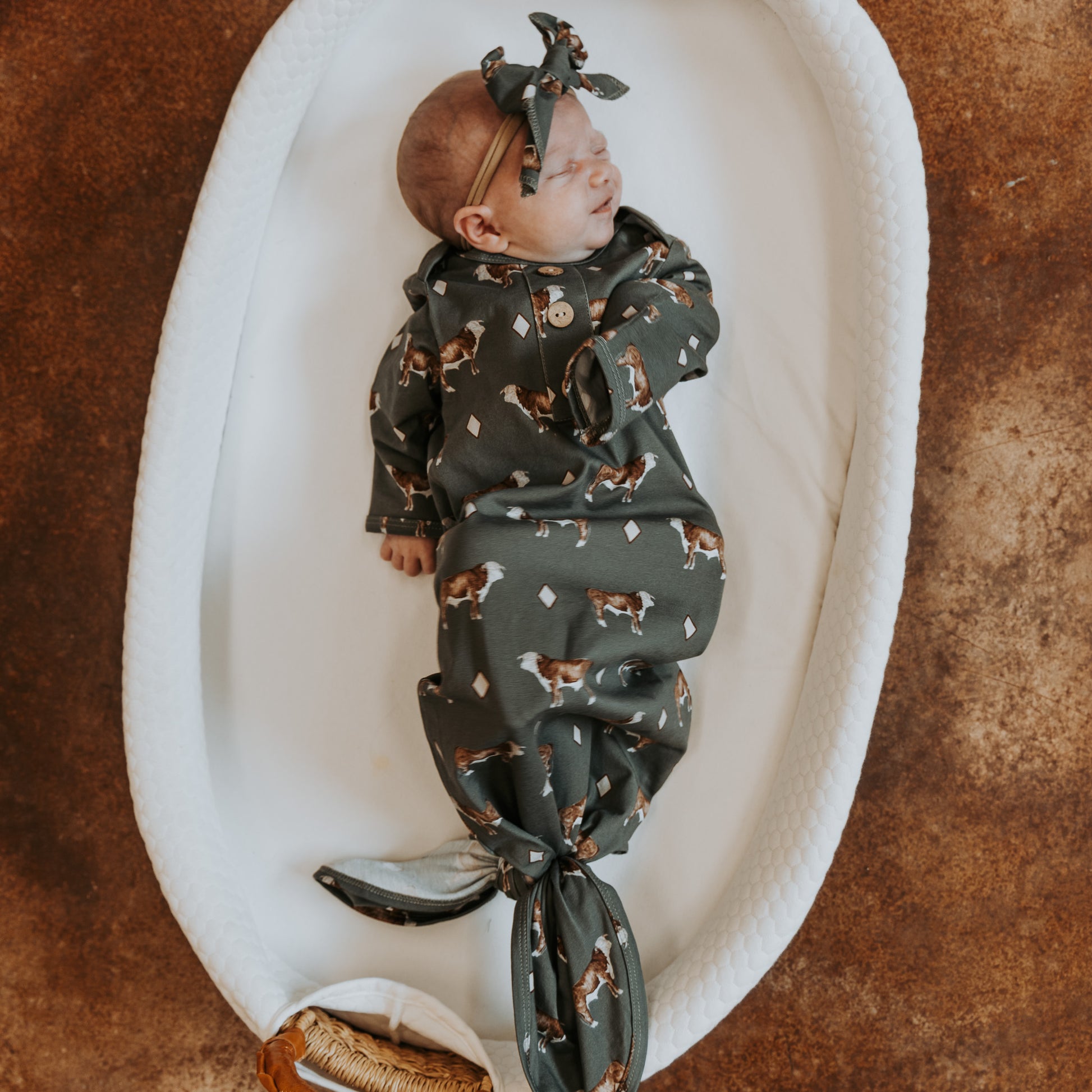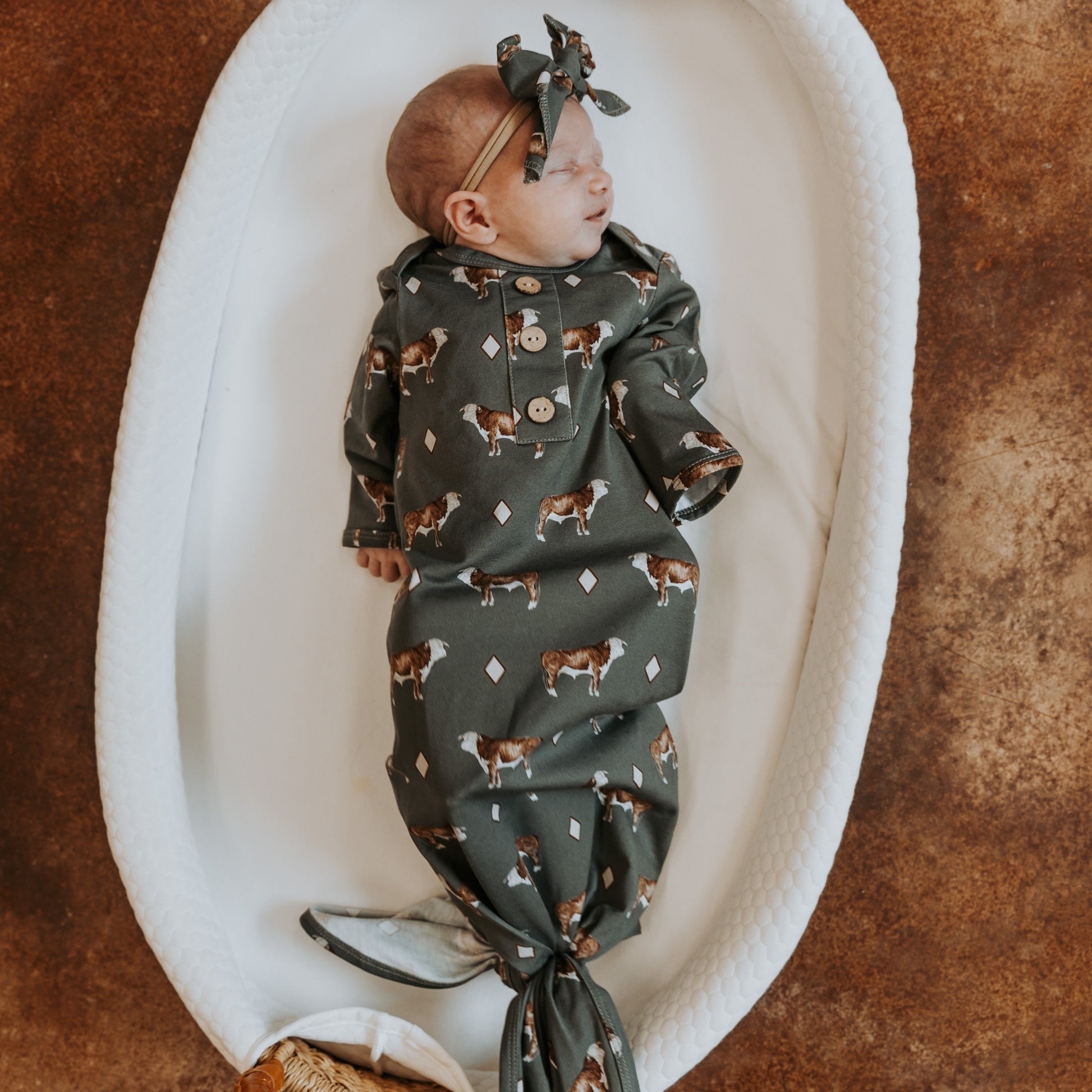 Perfect little headband to match your cute jammies! Made from an incredibly soft cotton/spandex blend and tied in a bow on a nylon stretch band. Fits newborn to about 9/12 months.