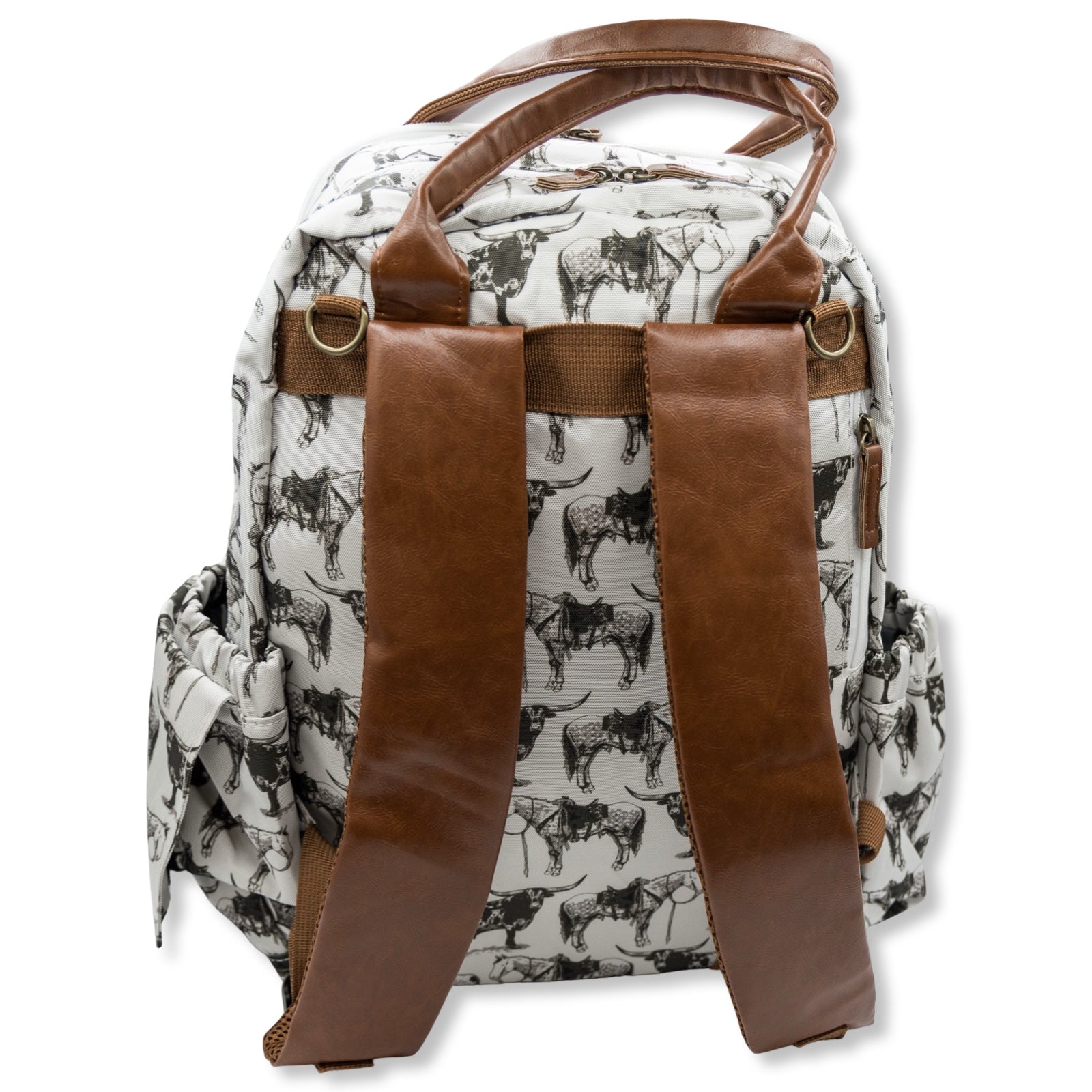 Classy, western full size diaper bag backpack. 13 Pockets! Two side pockets that fit small-large packs of wipes and any size bottles. Insulated front pocket fits 3 bottles and cutlery. Extra pockets inside for clothes, diapers, keys, cellphone, snacks, and more!