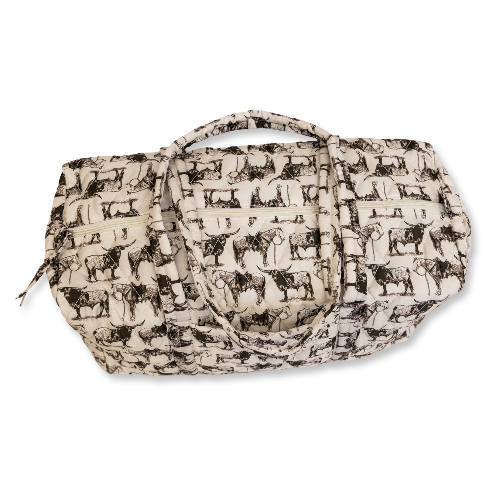 Classy, western full size luxury duffle bag. Two outside pockets and three additional pockets inside! Easy-clean fabric, heavy-duty zipper, padded carry straps and additional long strap included.