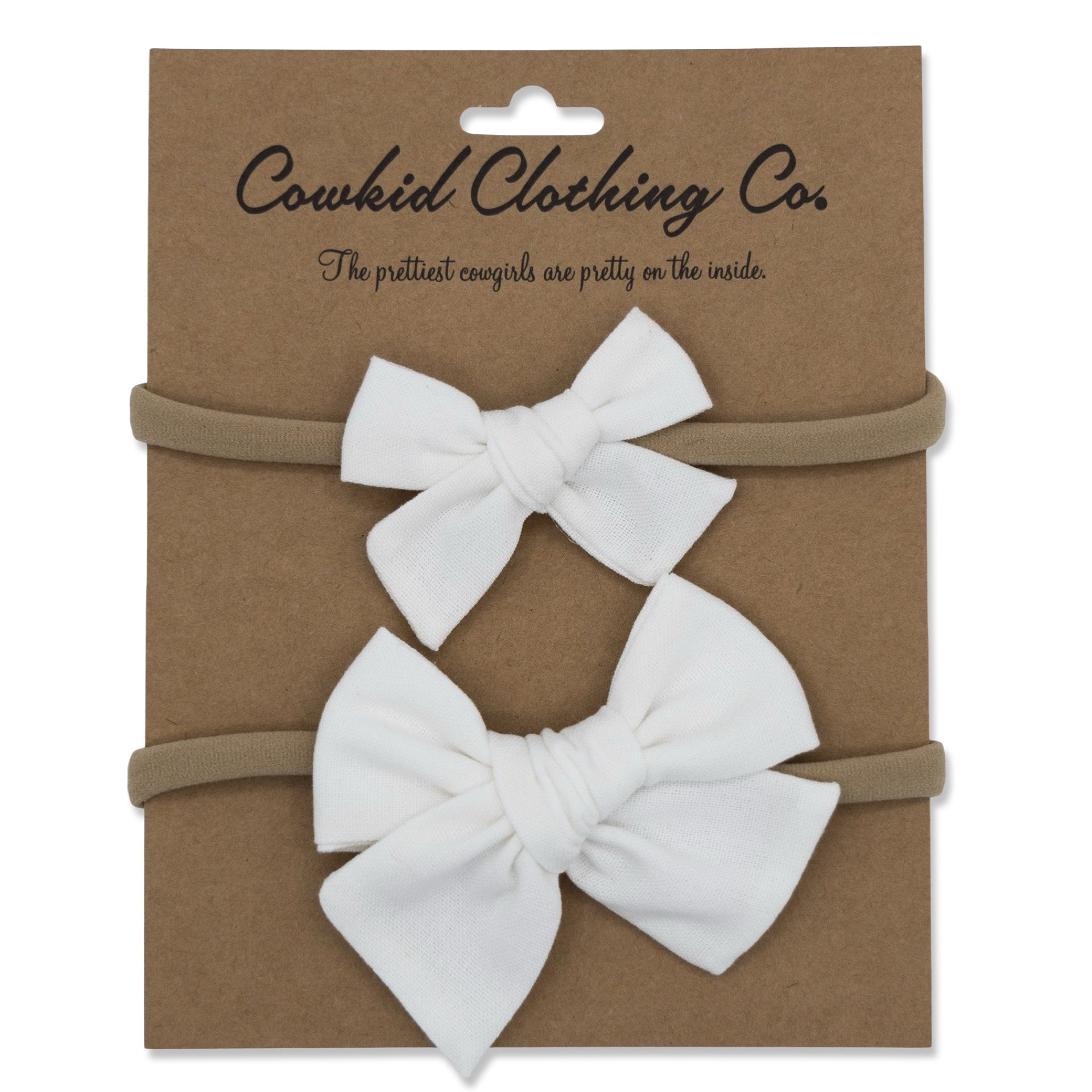 The sweetest little classic linen bows for your little cowgirls. 2 different sizes let them stay cute and stylish as they grow! Nylon band is so comfortable and stretchy for squishy little baby heads.