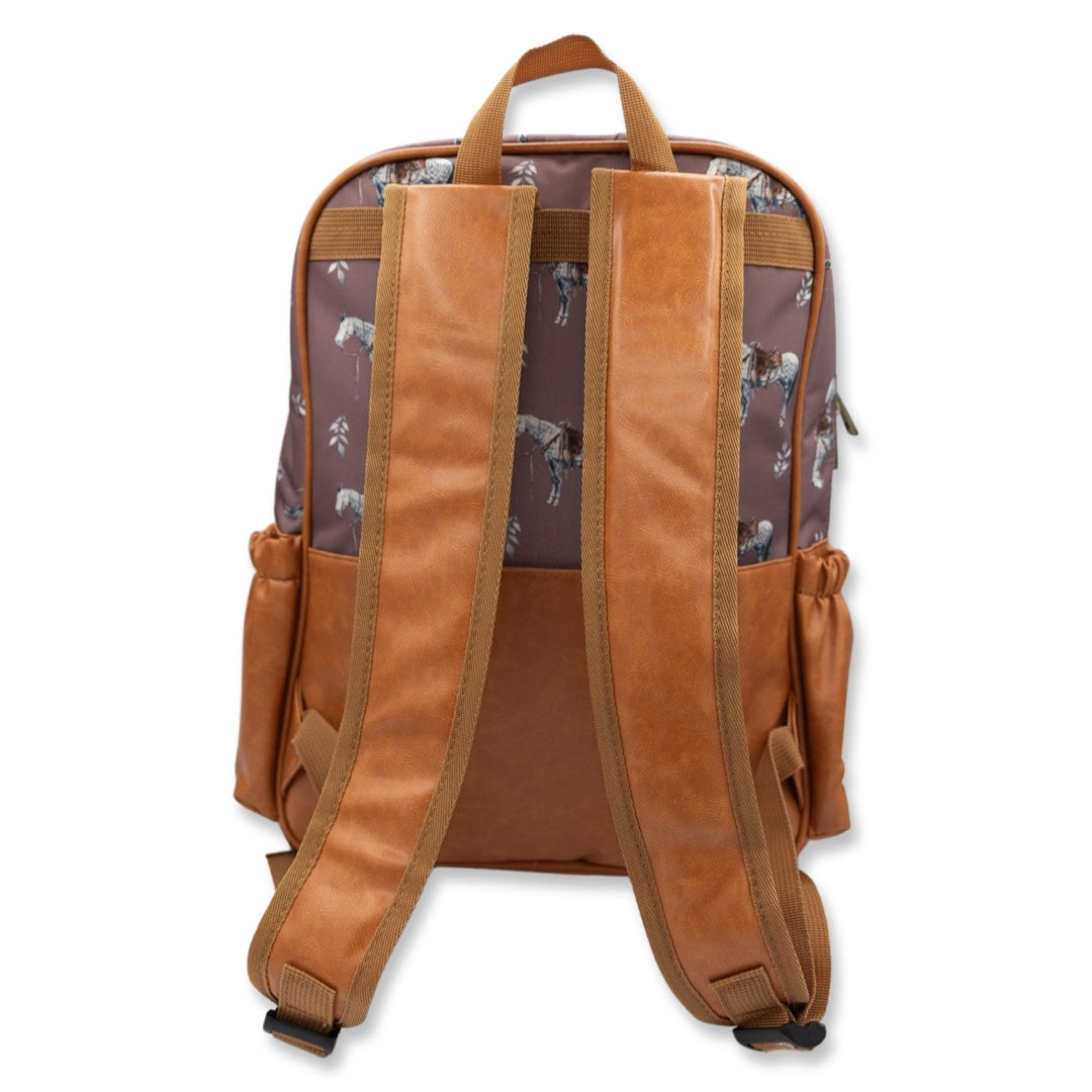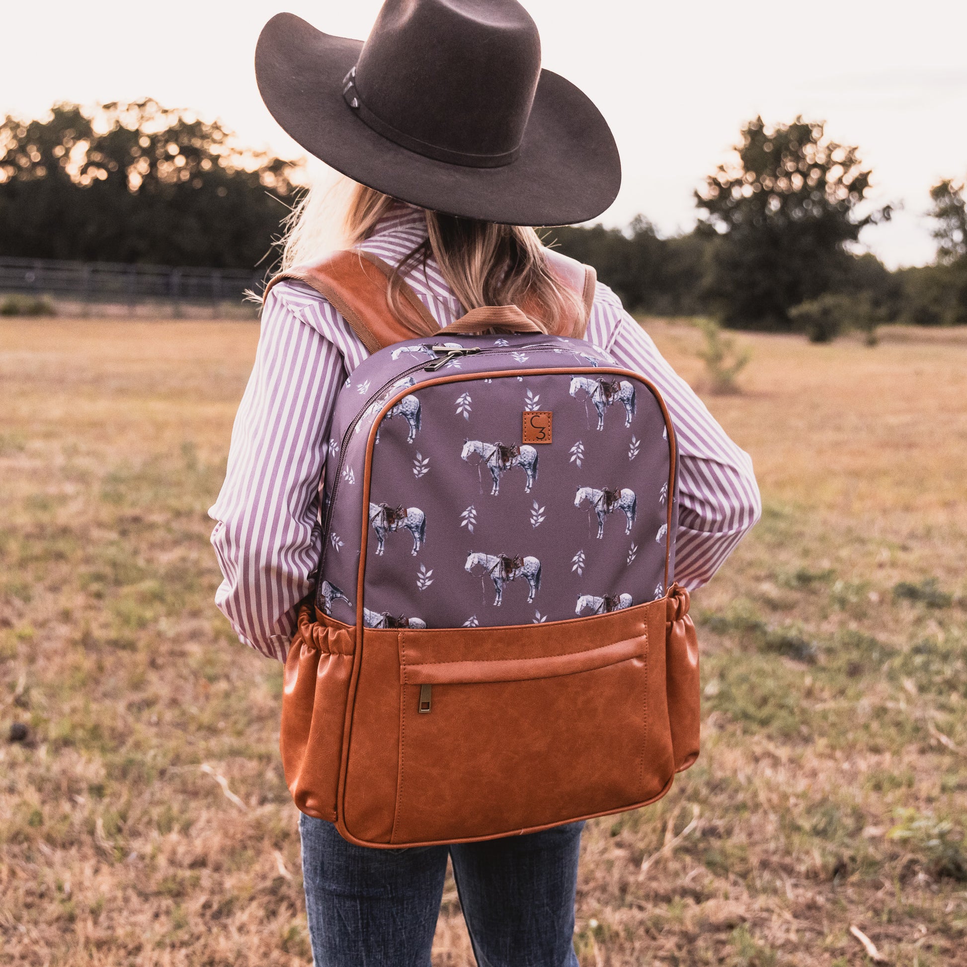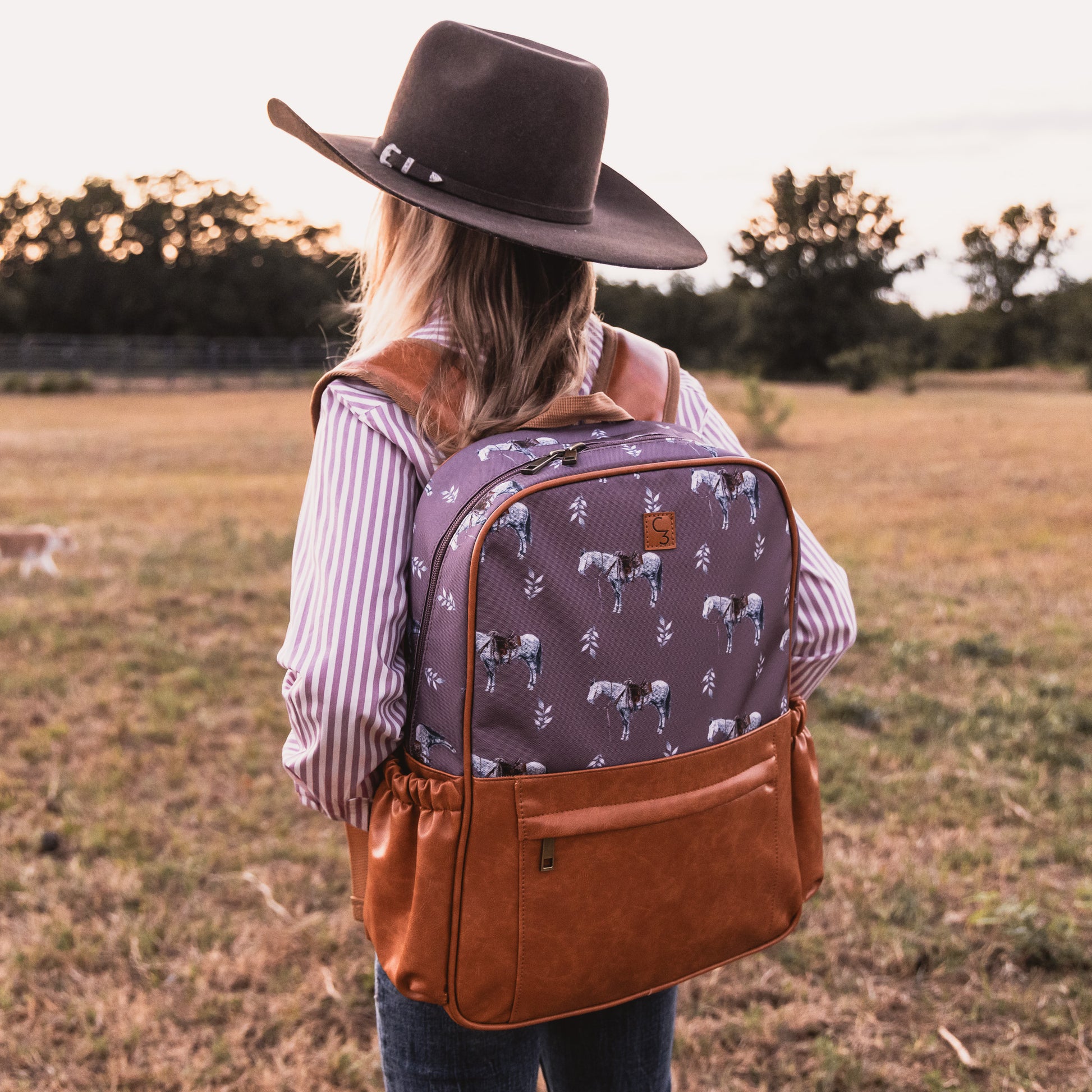 Classy, western full size backpack for age 4 up to adult. Perfect for pre-k to highschool or use it as a beautiful diaper bag. Two side pockets that fit small-large water bottles. Open back pocket and zippered front pocket to keep you organized!