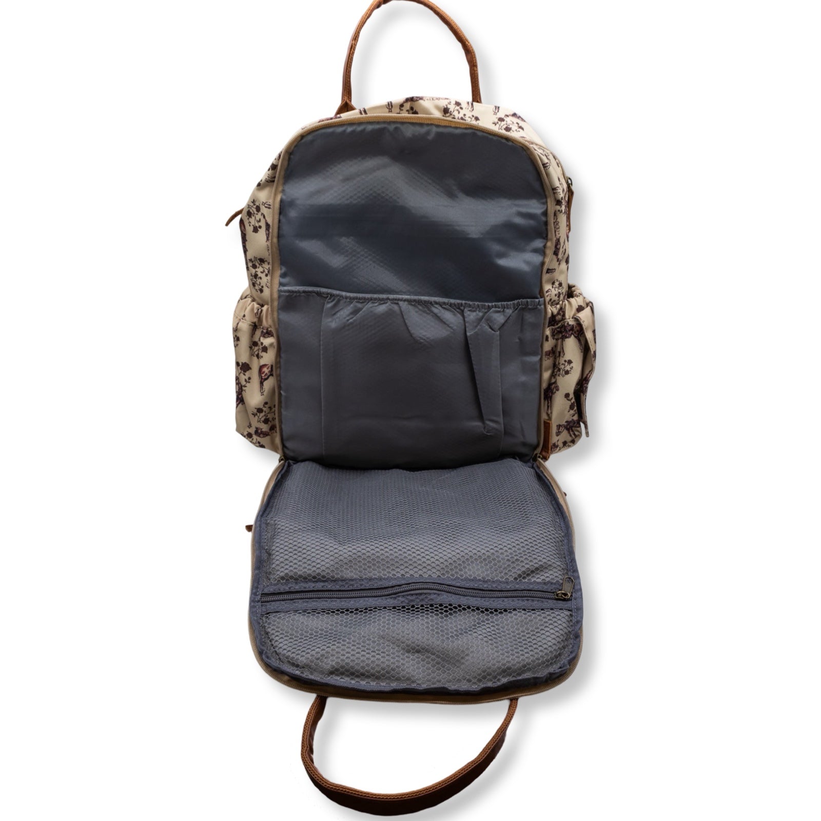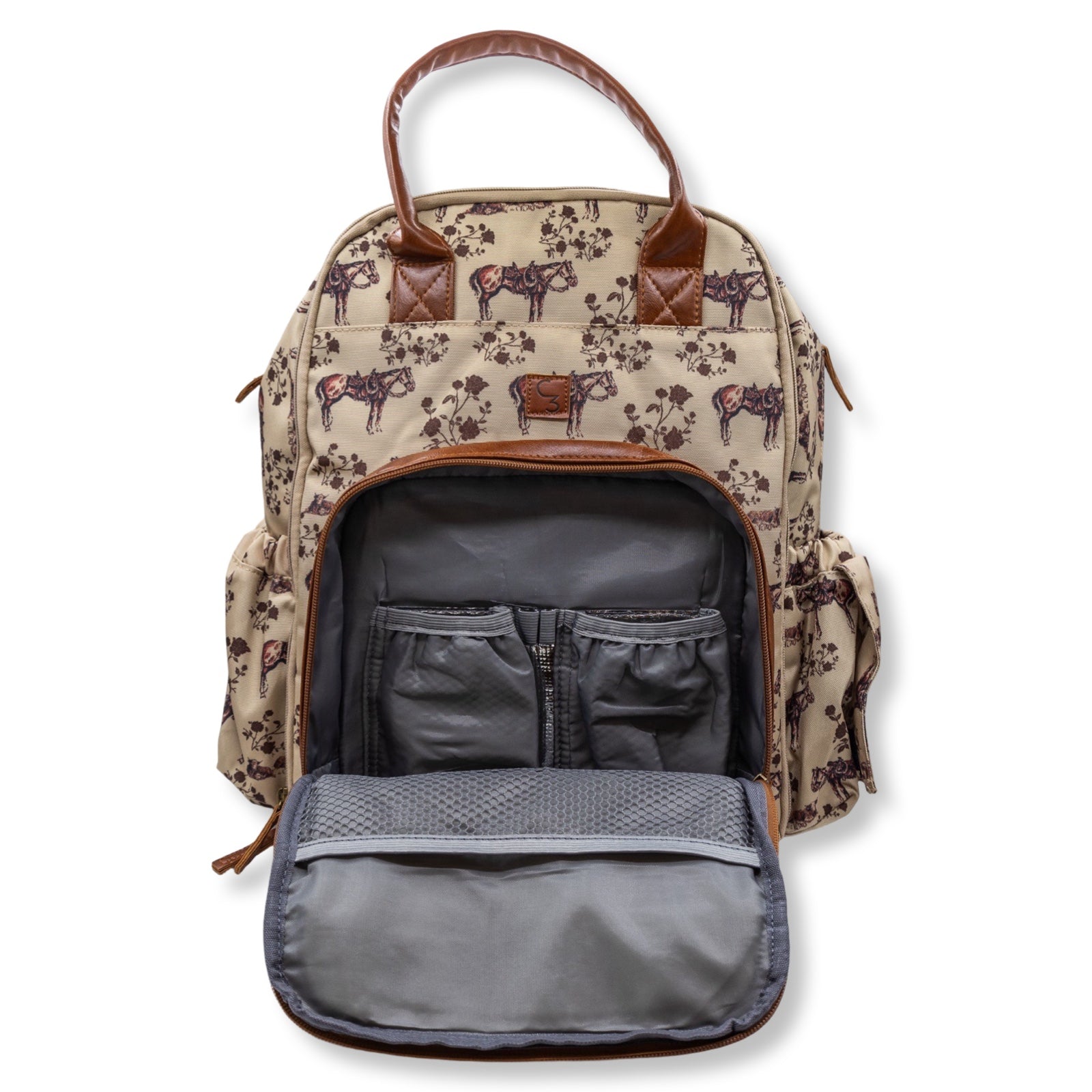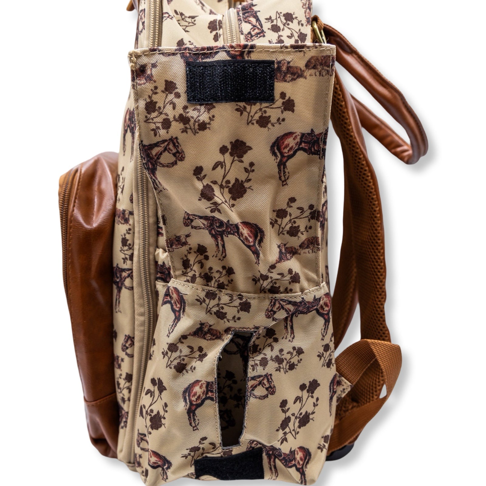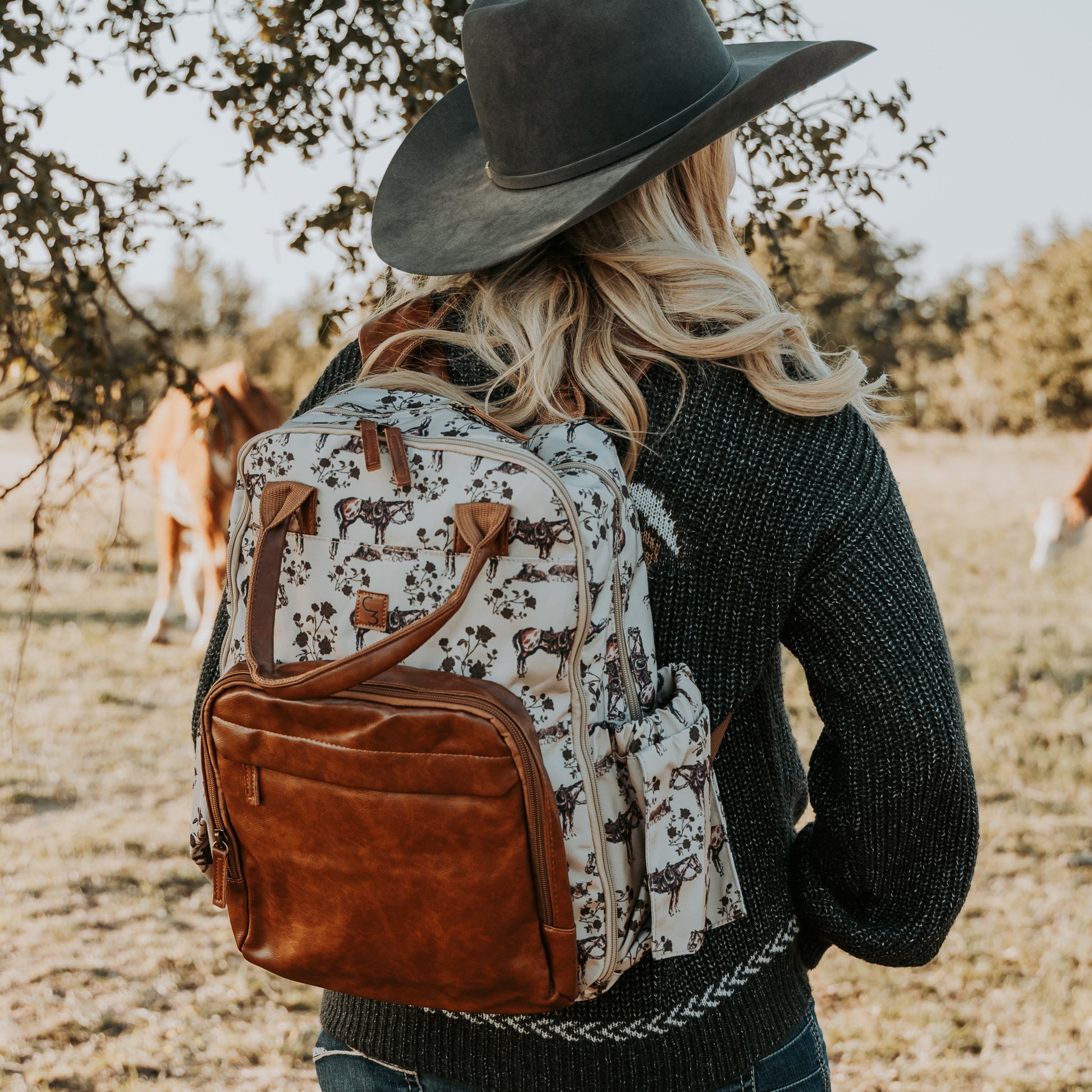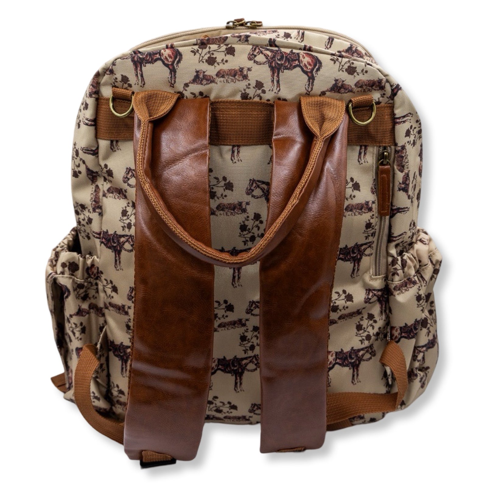 Classy, western full size diaper bag backpack. 13 Pockets! Two side pockets that fit small-large packs of wipes and any size bottles. Insulated front pocket fits 3 bottles and cutlery. Extra pockets inside for clothes, diapers, keys, cellphone, snacks, and more!