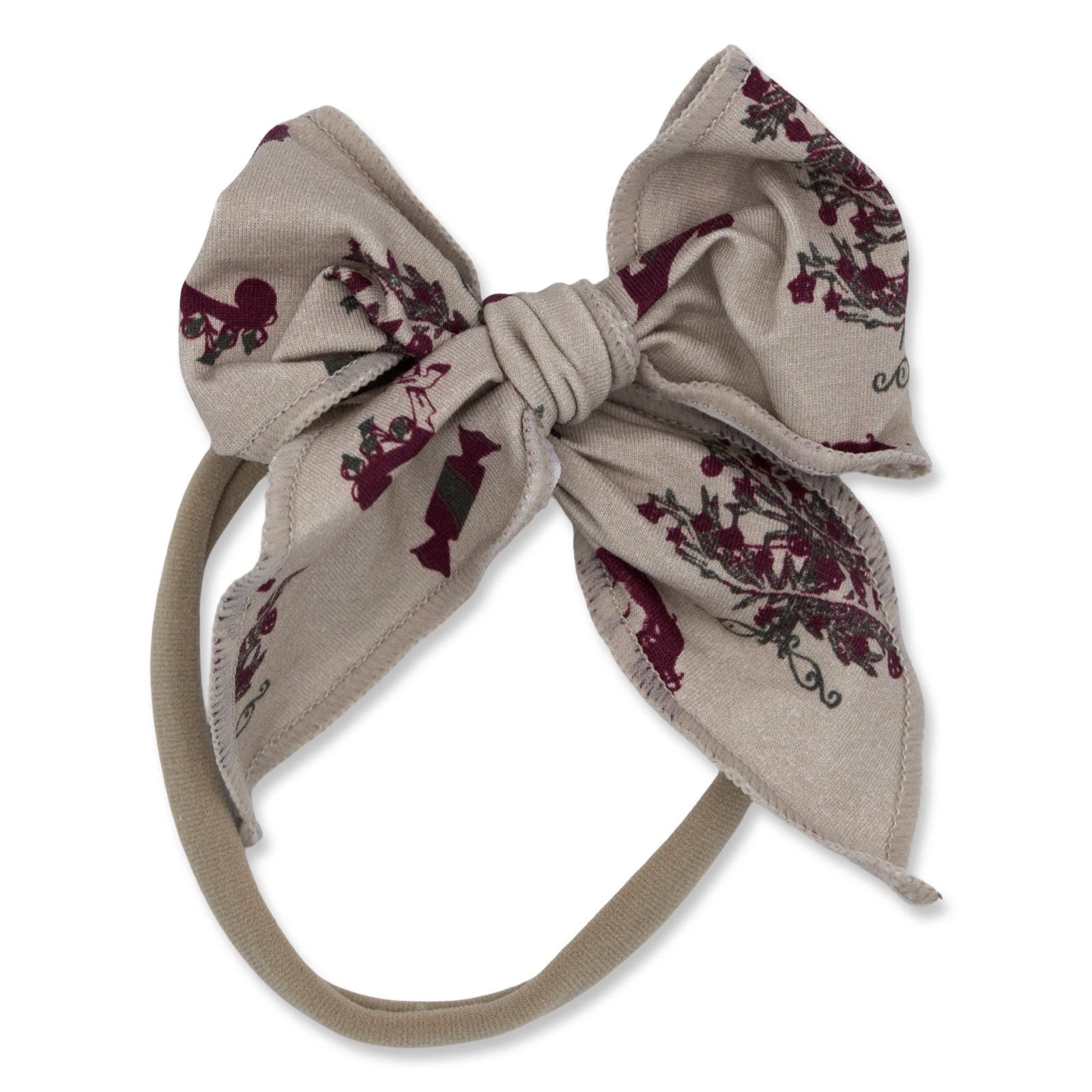 Perfect little headband to match your cute jammies! Made from an incredibly soft cotton/spandex blend and tied in a bow on a nylon stretch band. Very comfortable for heads without leaving an indention and isn't too tight. Fits newborn to about 18 months.