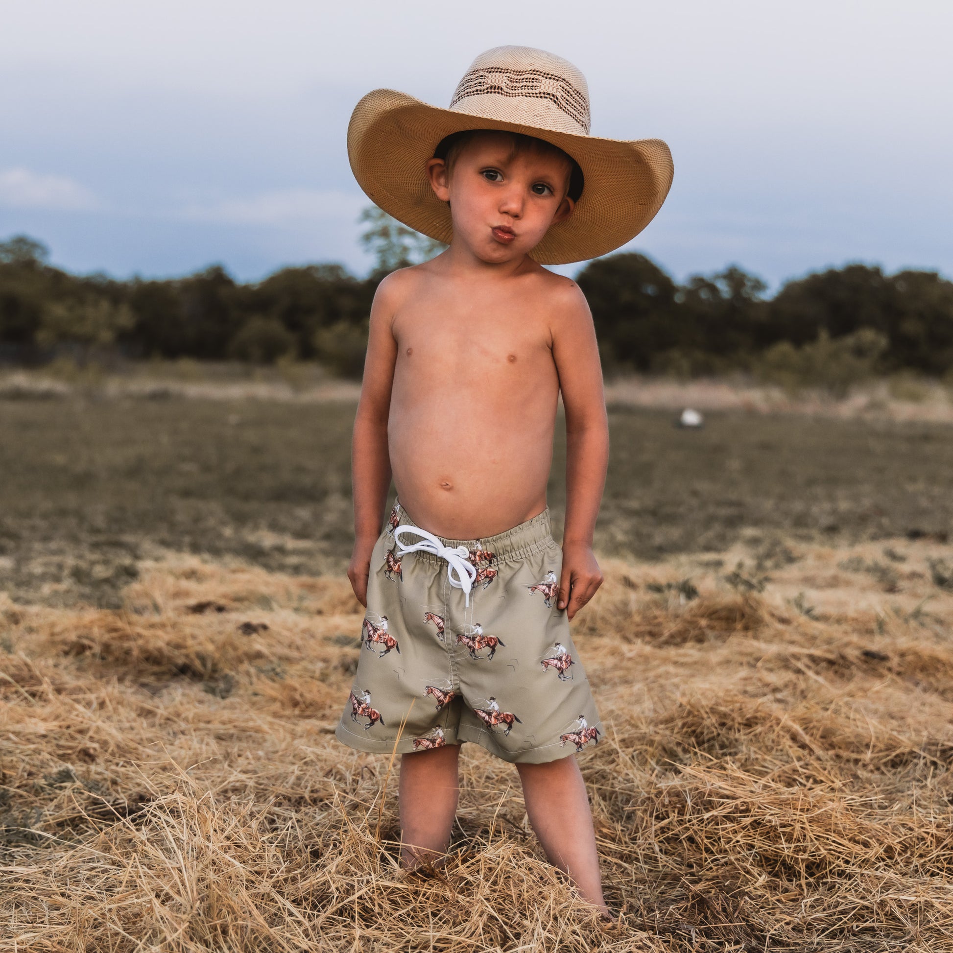 The coolest, high quality western swim trunks out there. Great fit, great material, side pocket, and mesh liner. Elastic waist but they also have a working drawstring. They're just amazing!