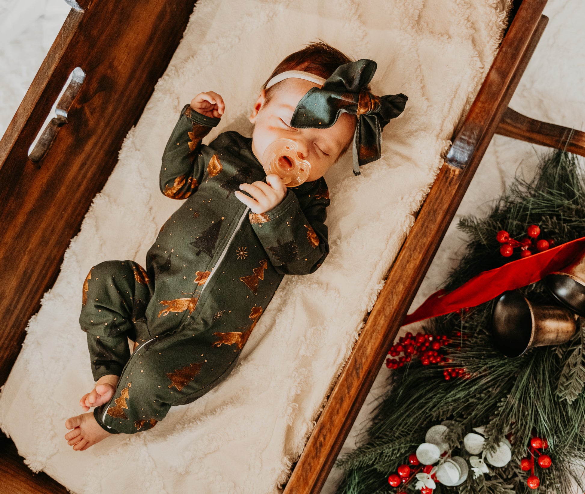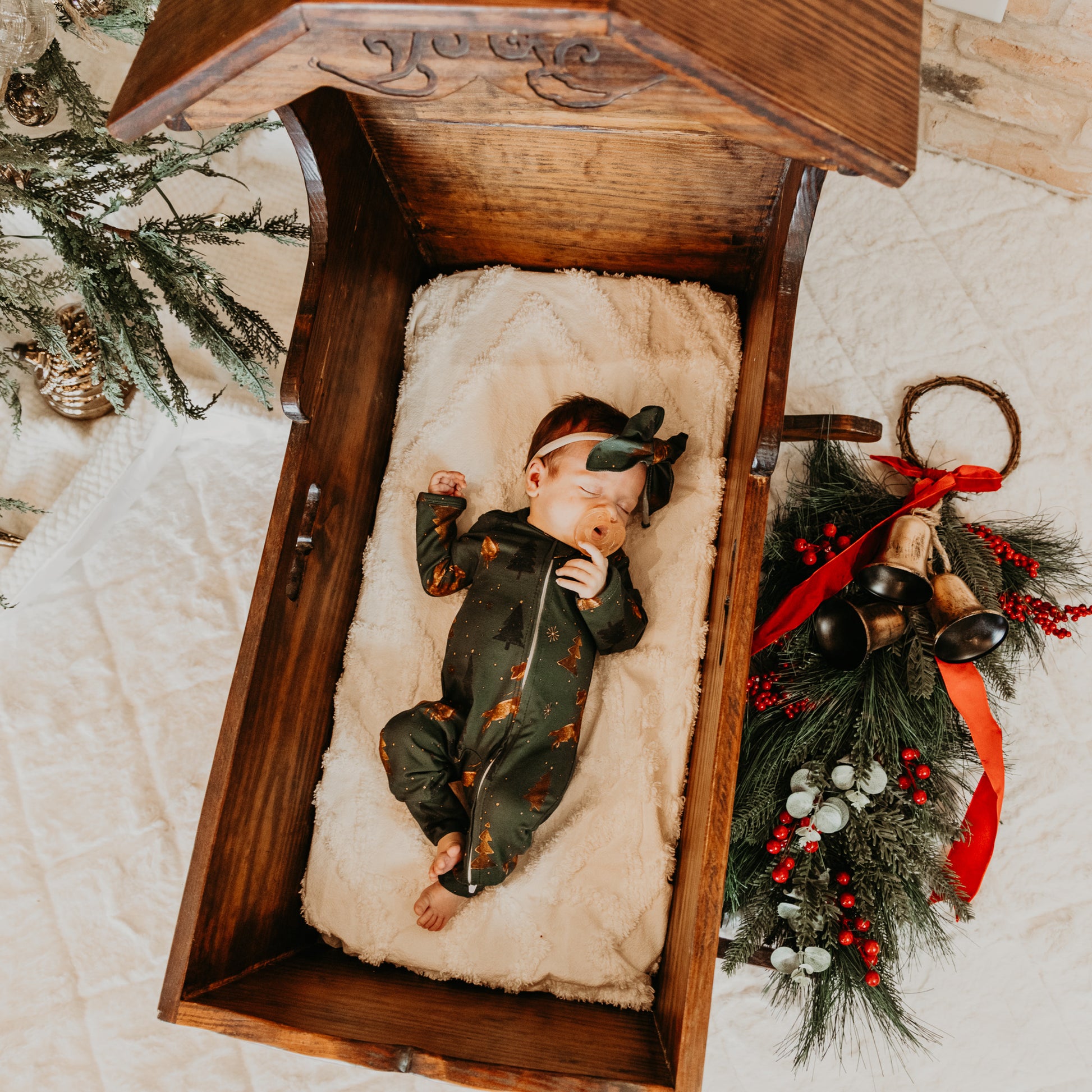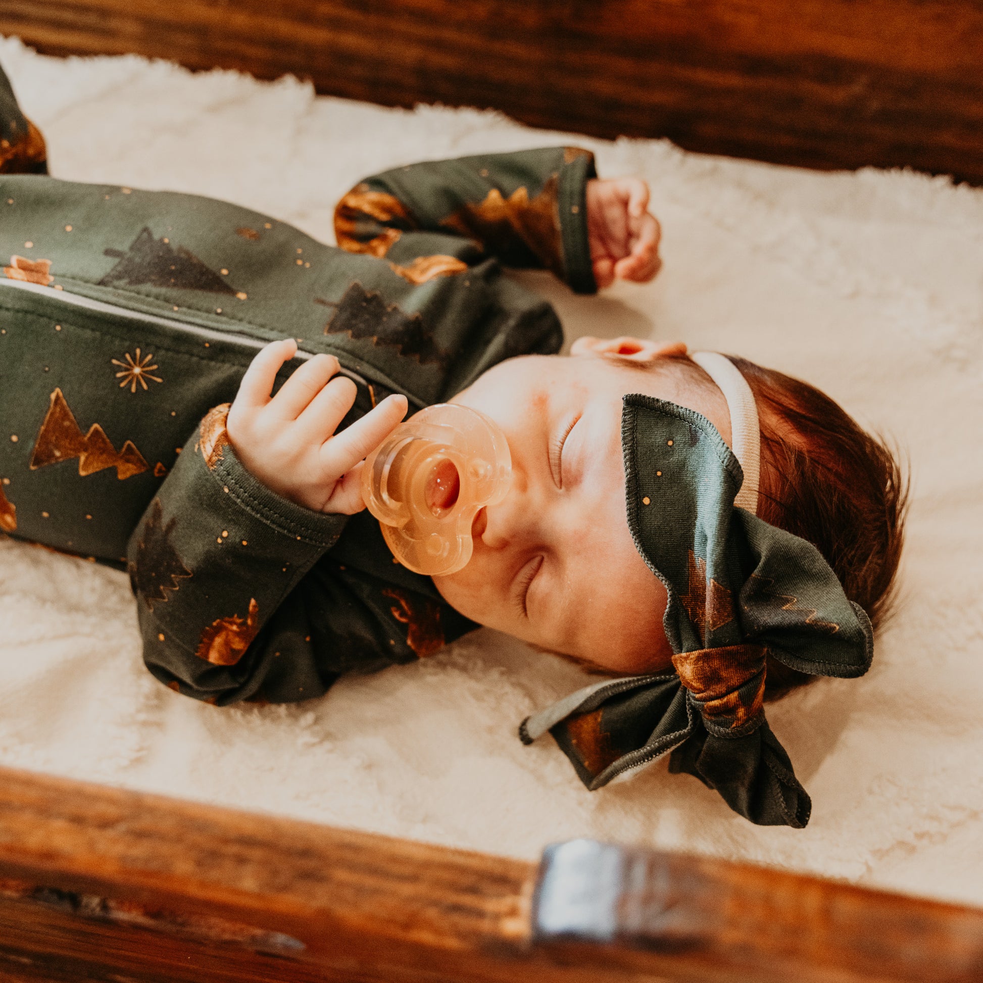 Perfect little headband to match your cute jammies! Made from an incredibly soft cotton/spandex blend and tied in a bow on a nylon stretch band. Very comfortable for heads without leaving an indention and isn't too tight. Fits newborn to about 18 months.