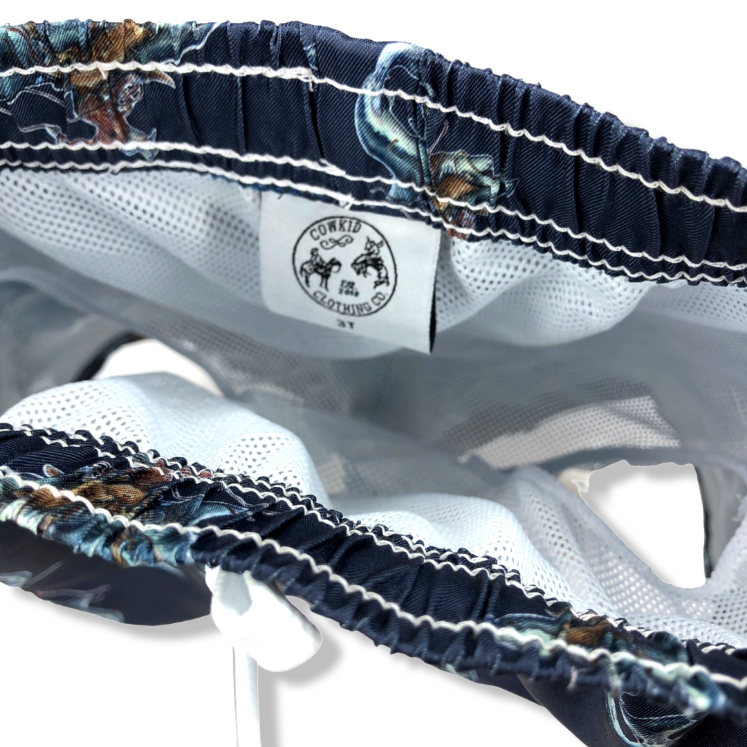The coolest, high quality western swim trunks out there. Great fit, great material, side pocket, and mesh liner. Elastic waist but they also have a working drawstring. They're just amazing!