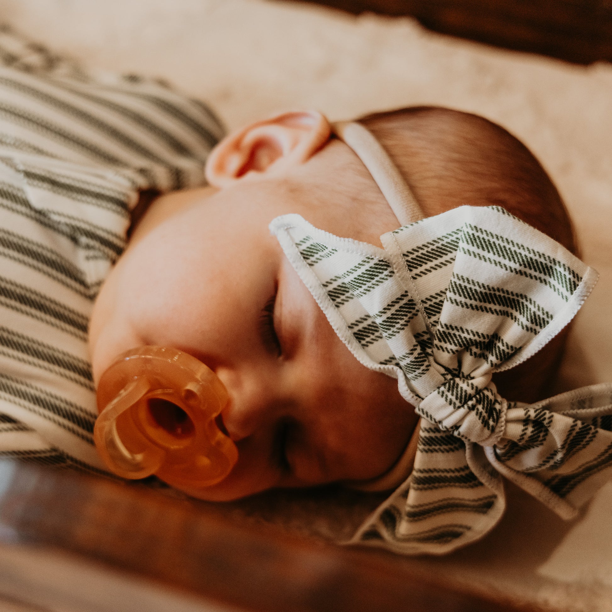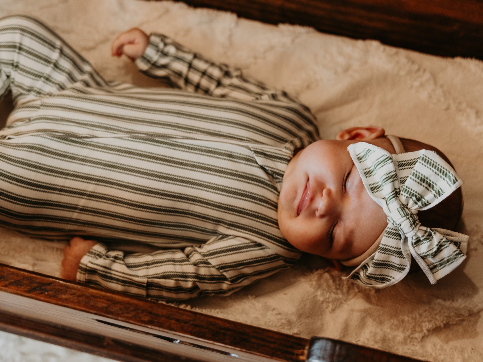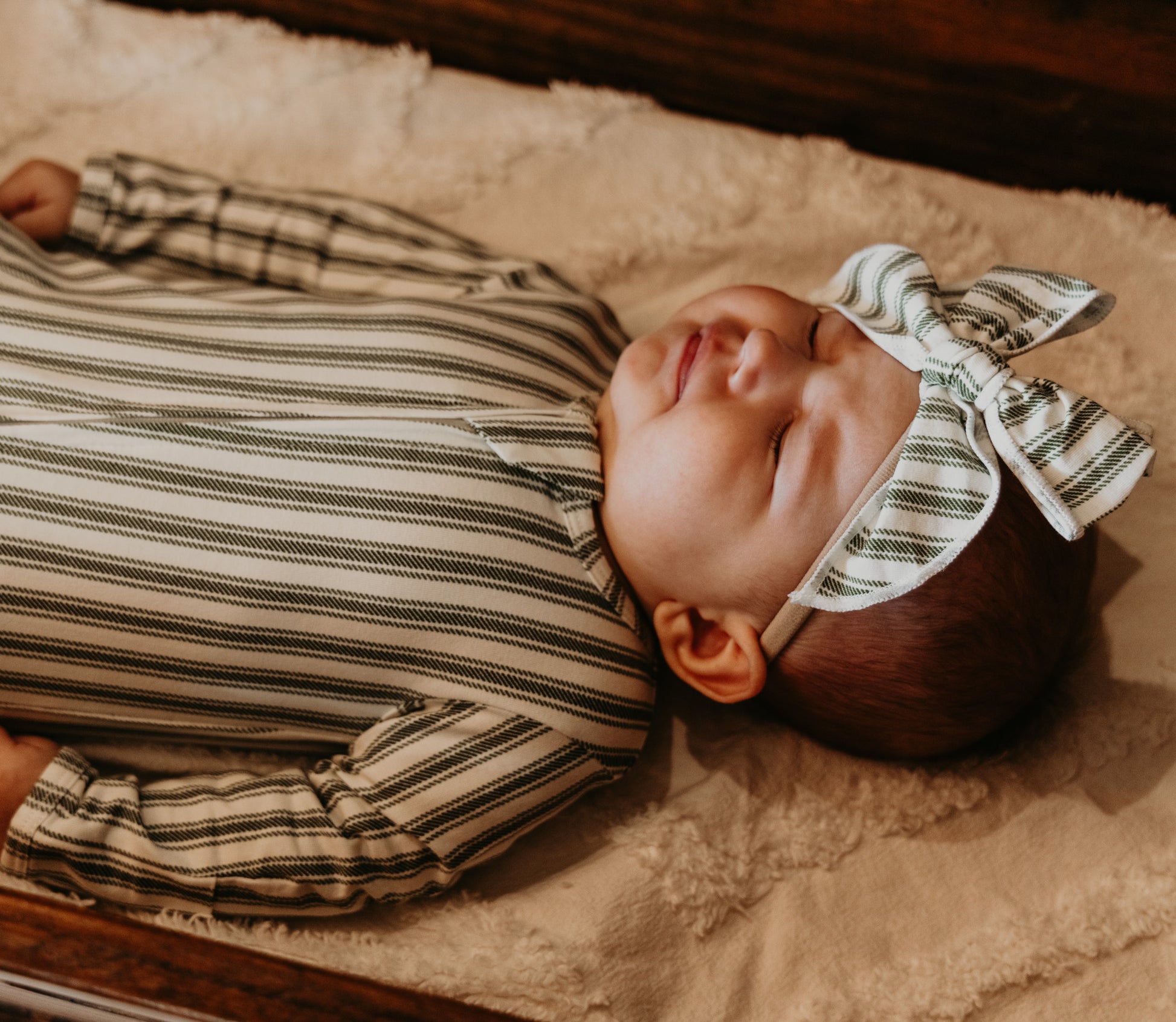 Perfect little headband to match your cute jammies! Made from an incredibly soft cotton/spandex blend and tied in a bow on a nylon stretch band. Very comfortable for heads without leaving an indention and isn't too tight. Fits newborn to about 18 months.