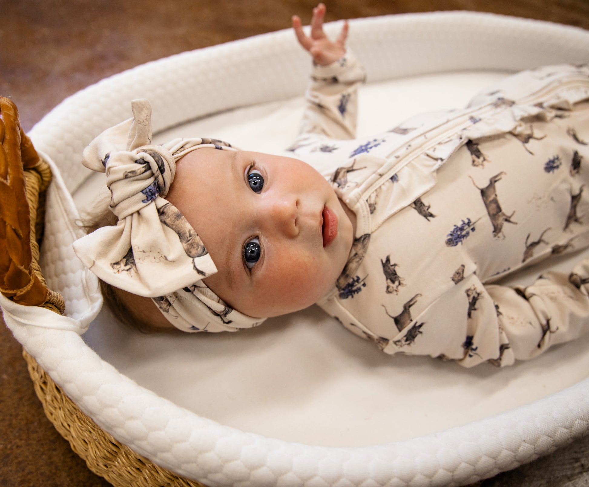 Perfect little headband to match your cute jammies! Made from an incredibly soft cotton/spandex blend. Fits newborn to about 9 months. Adjustable and can be retied to fit.