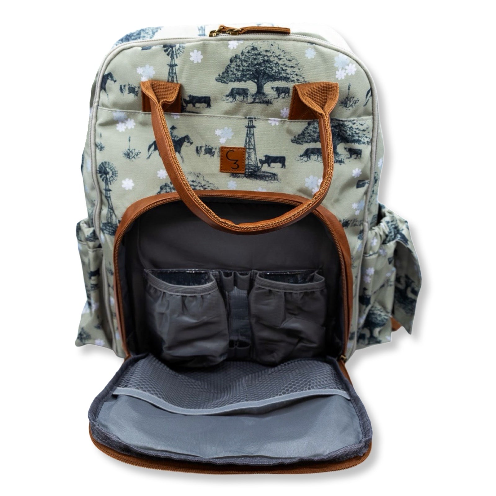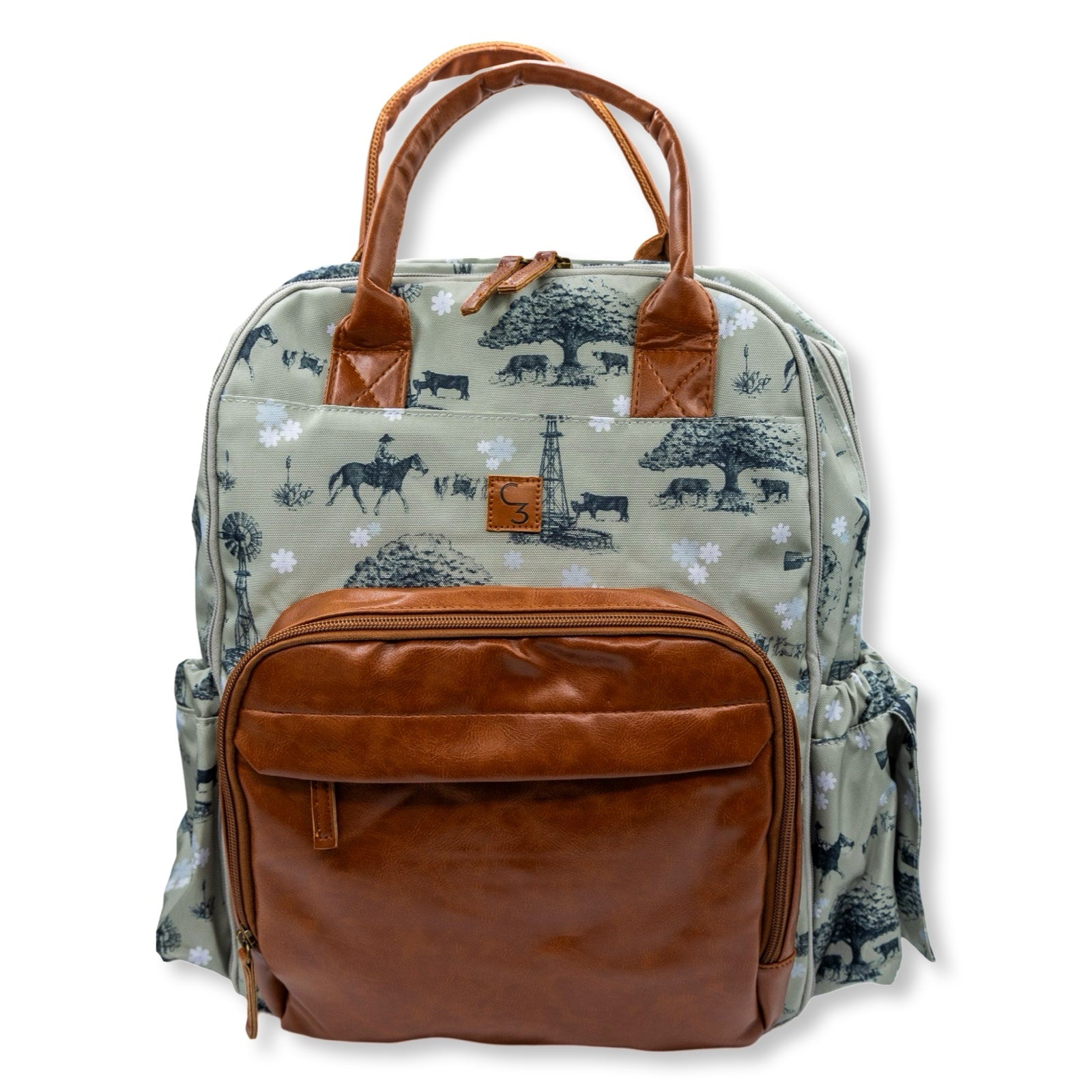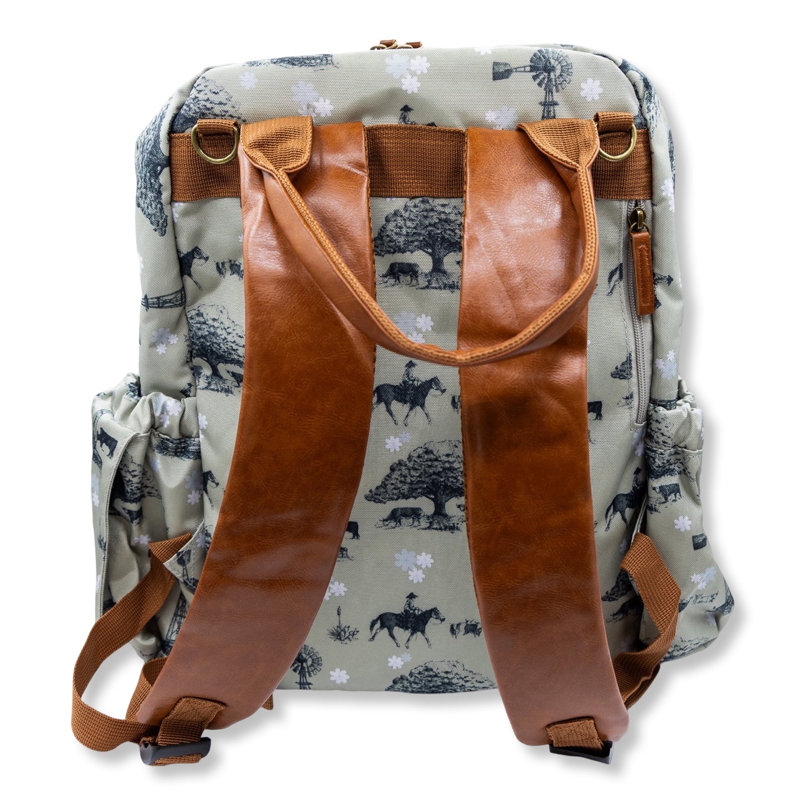 Classy, western full size diaper bag backpack. 13 Pockets! Two side pockets that fit small-large packs of wipes and any size bottles. Insulated front pocket fits 3 bottles and cutlery. Extra pockets inside for clothes, diapers, keys, cellphone, snacks, and more!