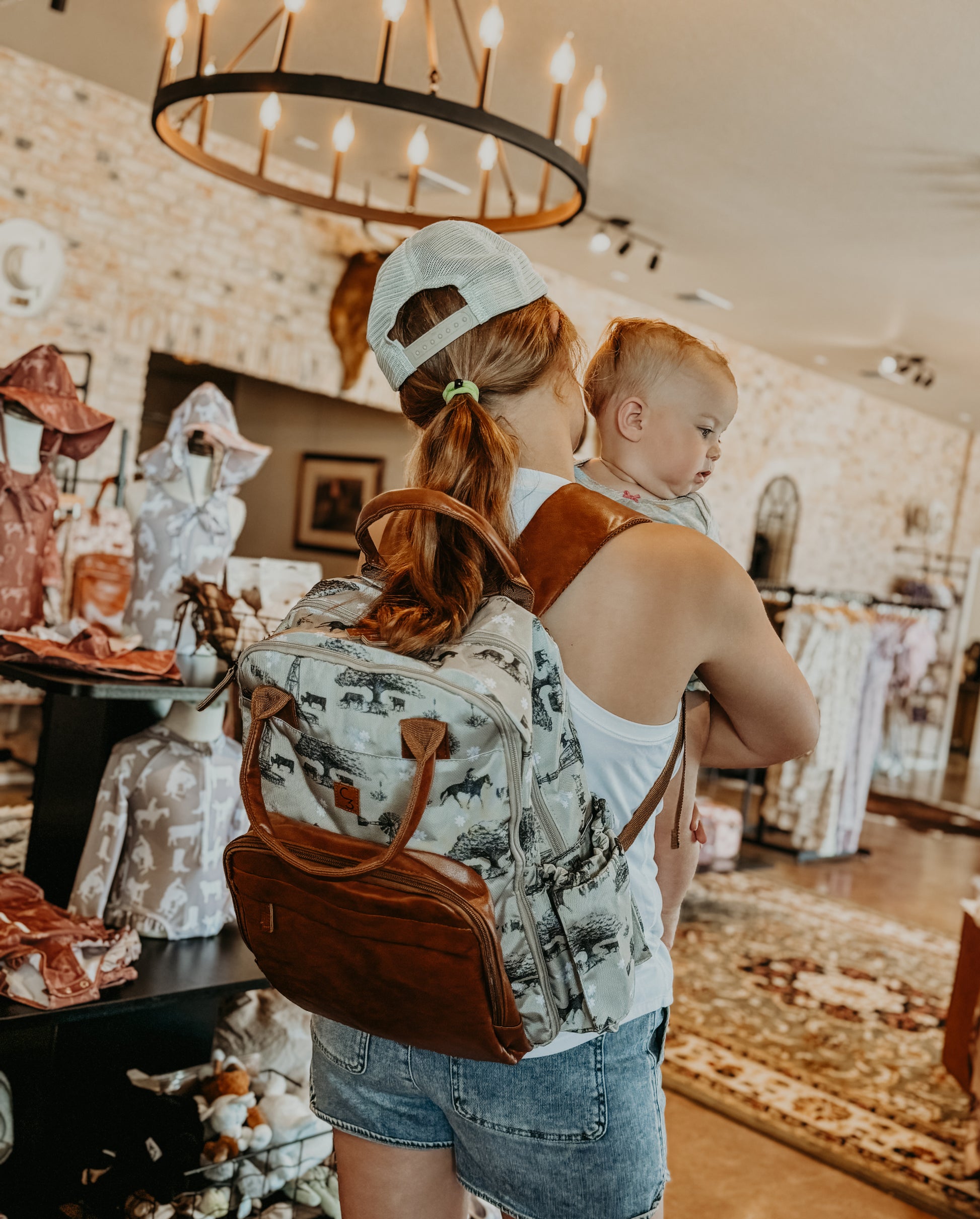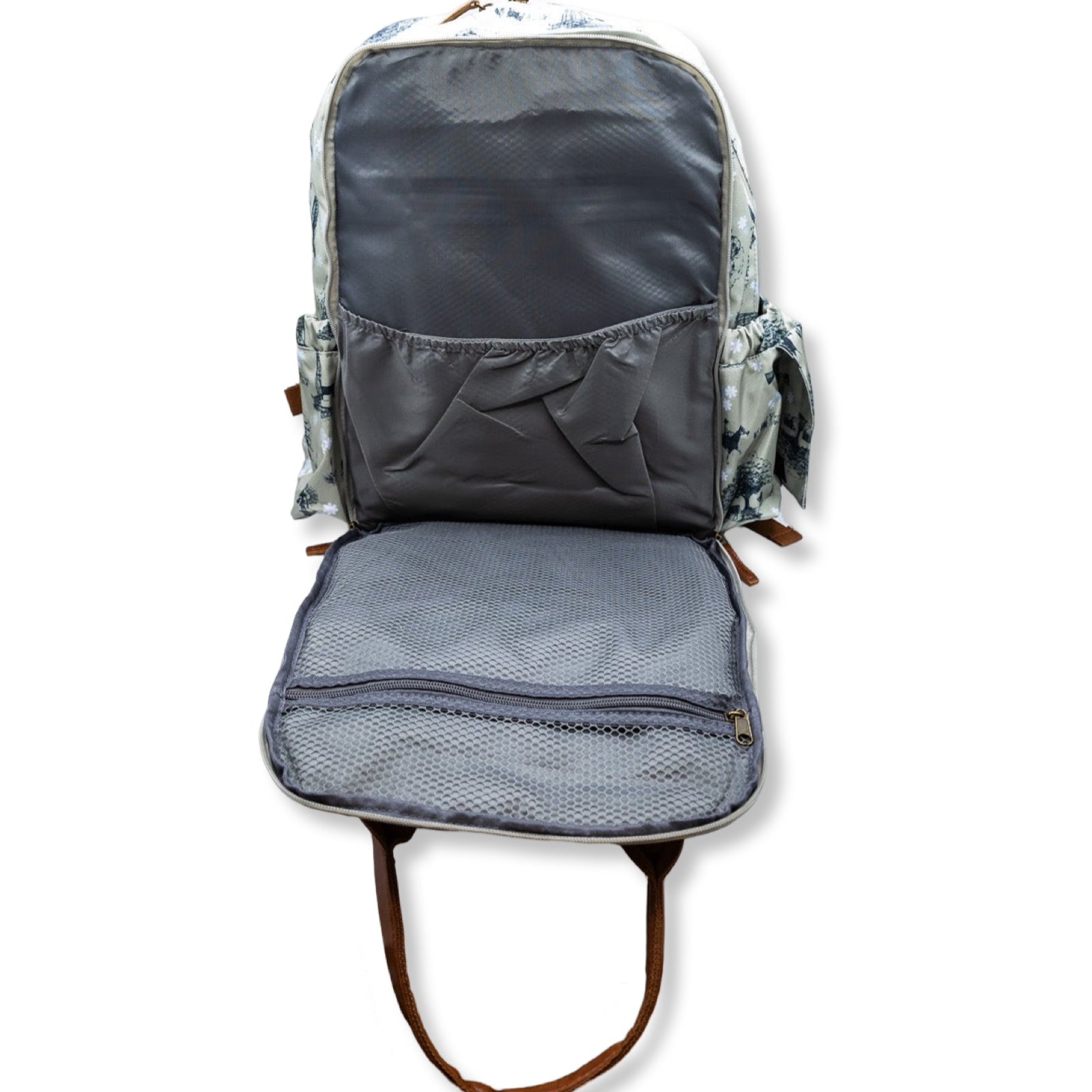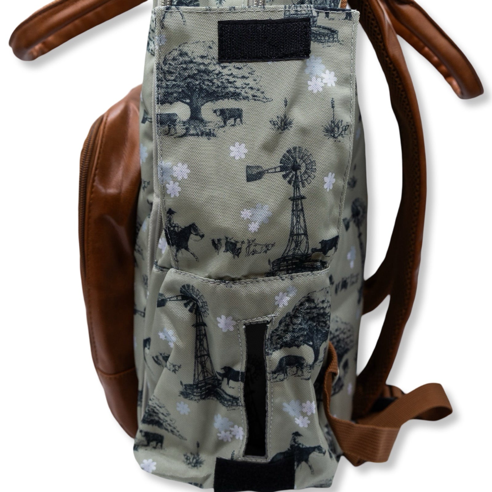 Classy, western full size diaper bag backpack. 13 Pockets! Two side pockets that fit small-large packs of wipes and any size bottles. Insulated front pocket fits 3 bottles and cutlery. Extra pockets inside for clothes, diapers, keys, cellphone, snacks, and more!