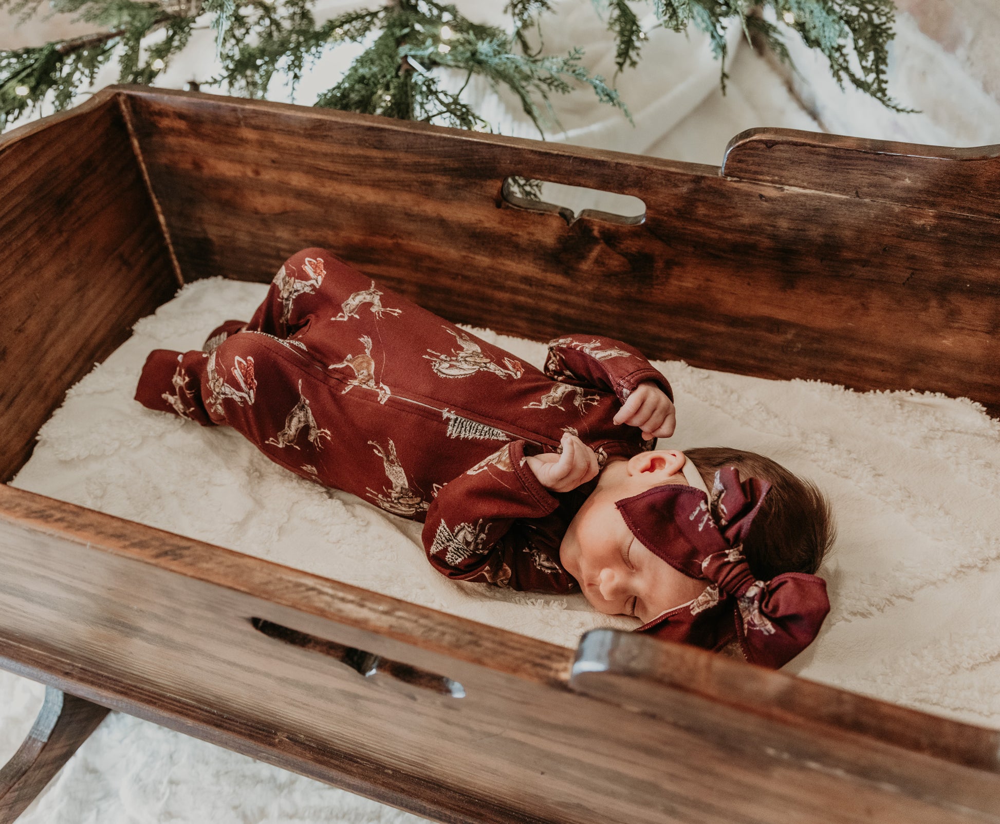 Perfect little headband to match your cute jammies! Made from an incredibly soft cotton/spandex blend and tied in a bow on a nylon stretch band. Very comfortable for heads without leaving an indention and isn't too tight. Fits newborn to about 18 months.