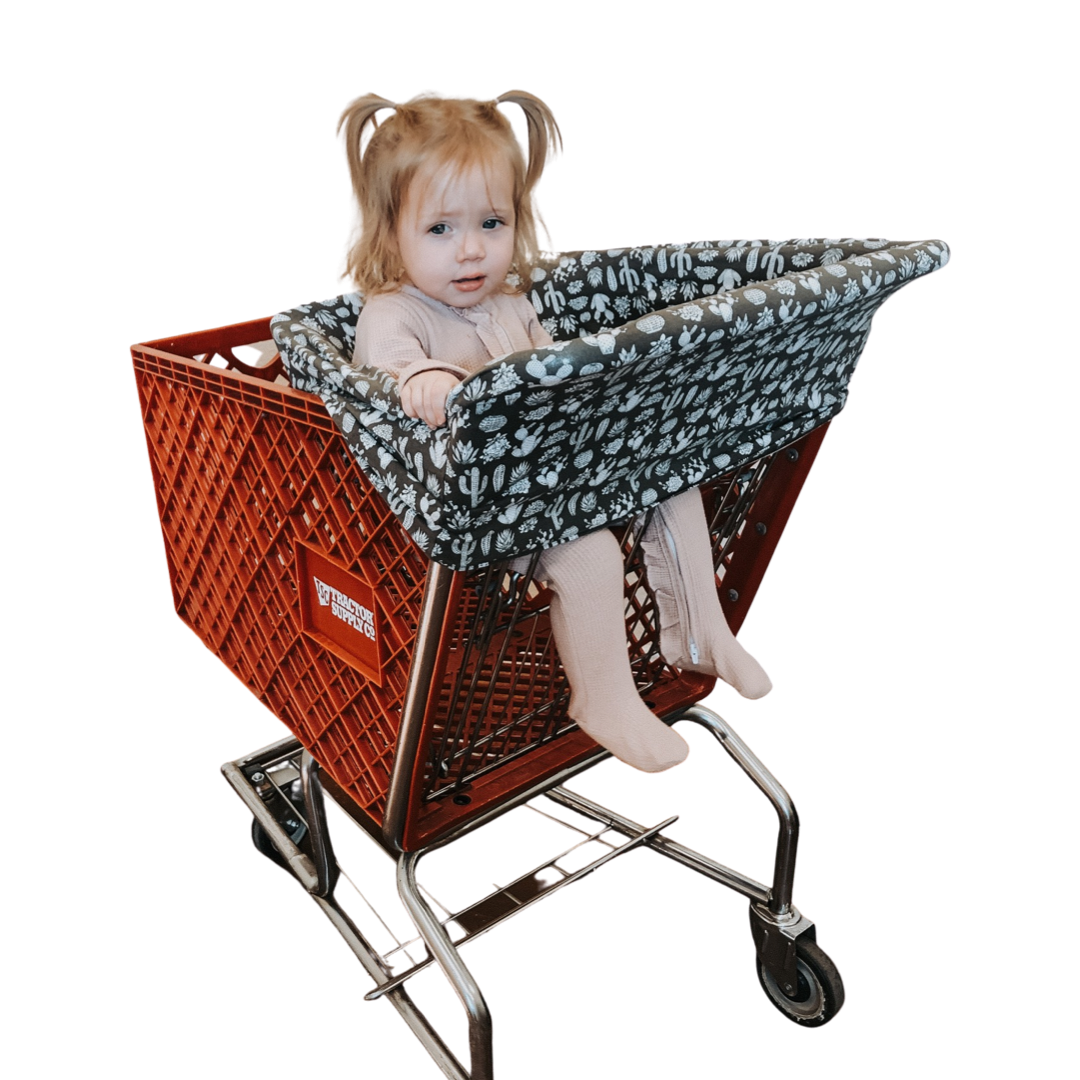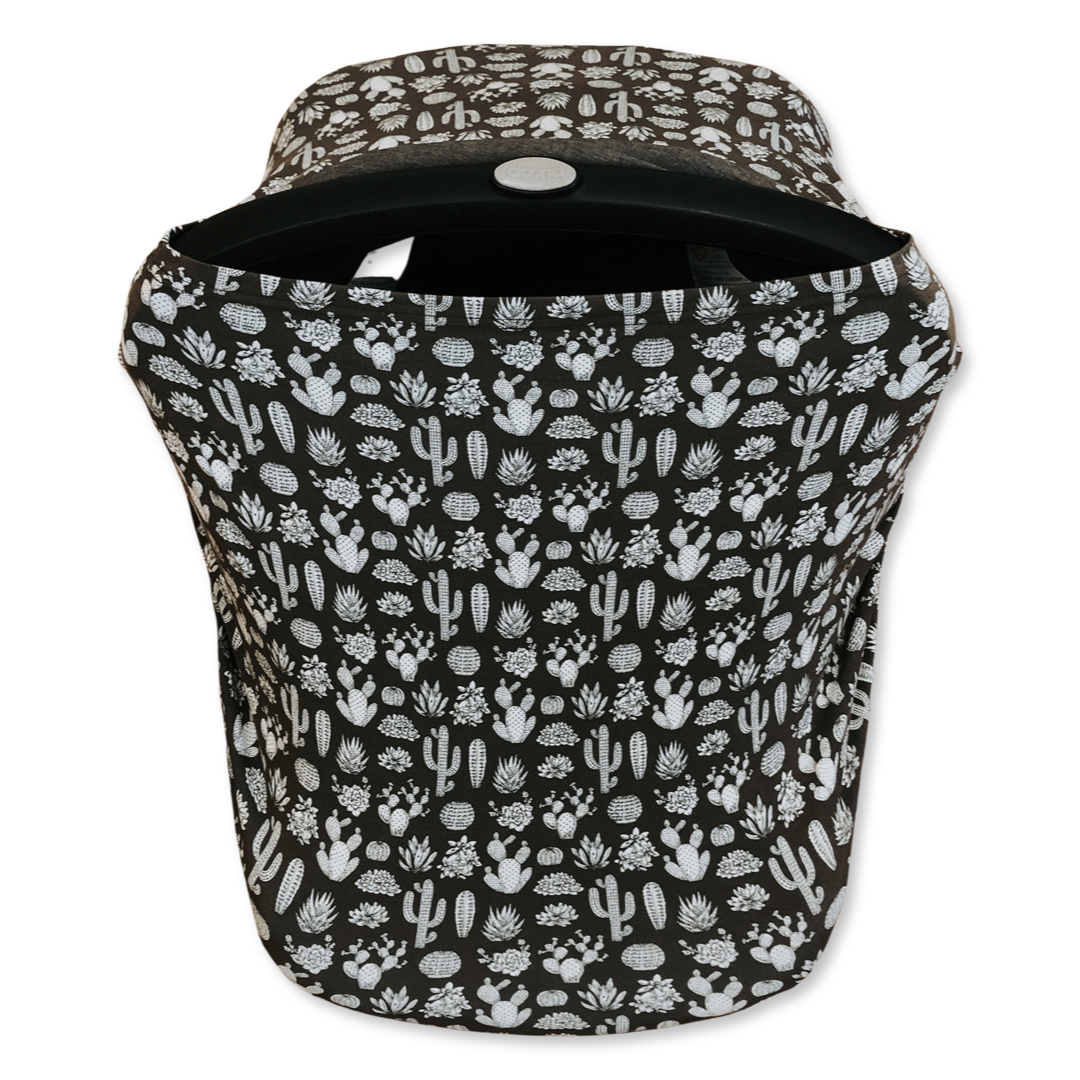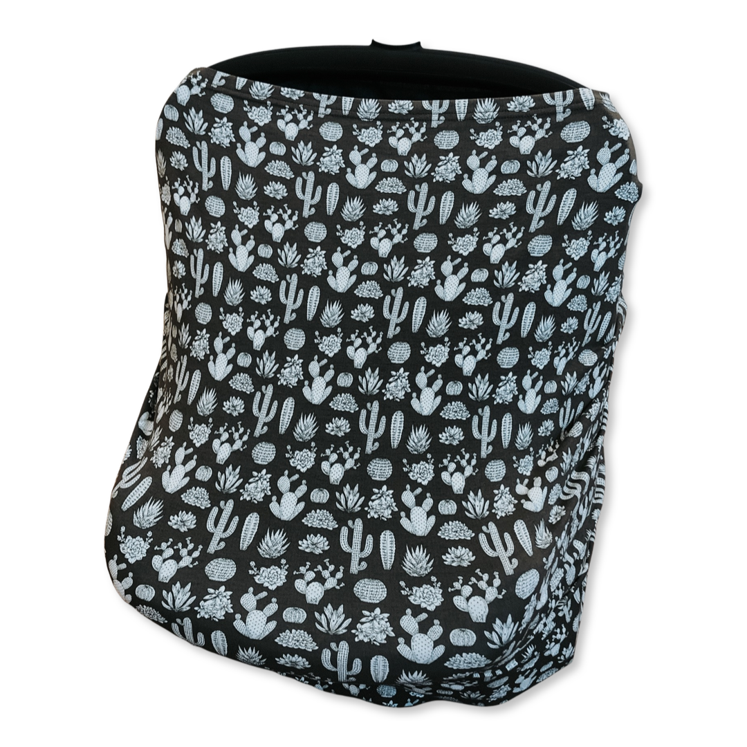 An amazing, versatile car seat cover that can also be used as a shopping cart cover, high chair cover, nursing cover, and can also be worn as a scarf for nursing mothers.