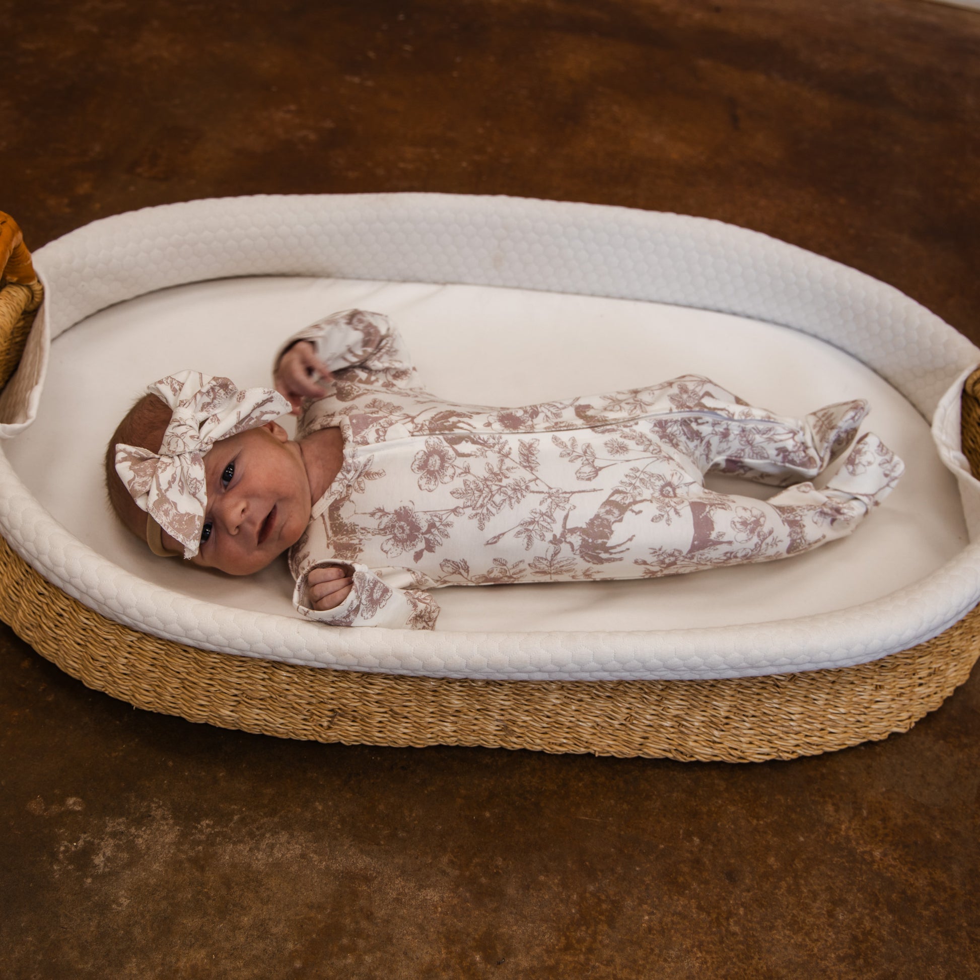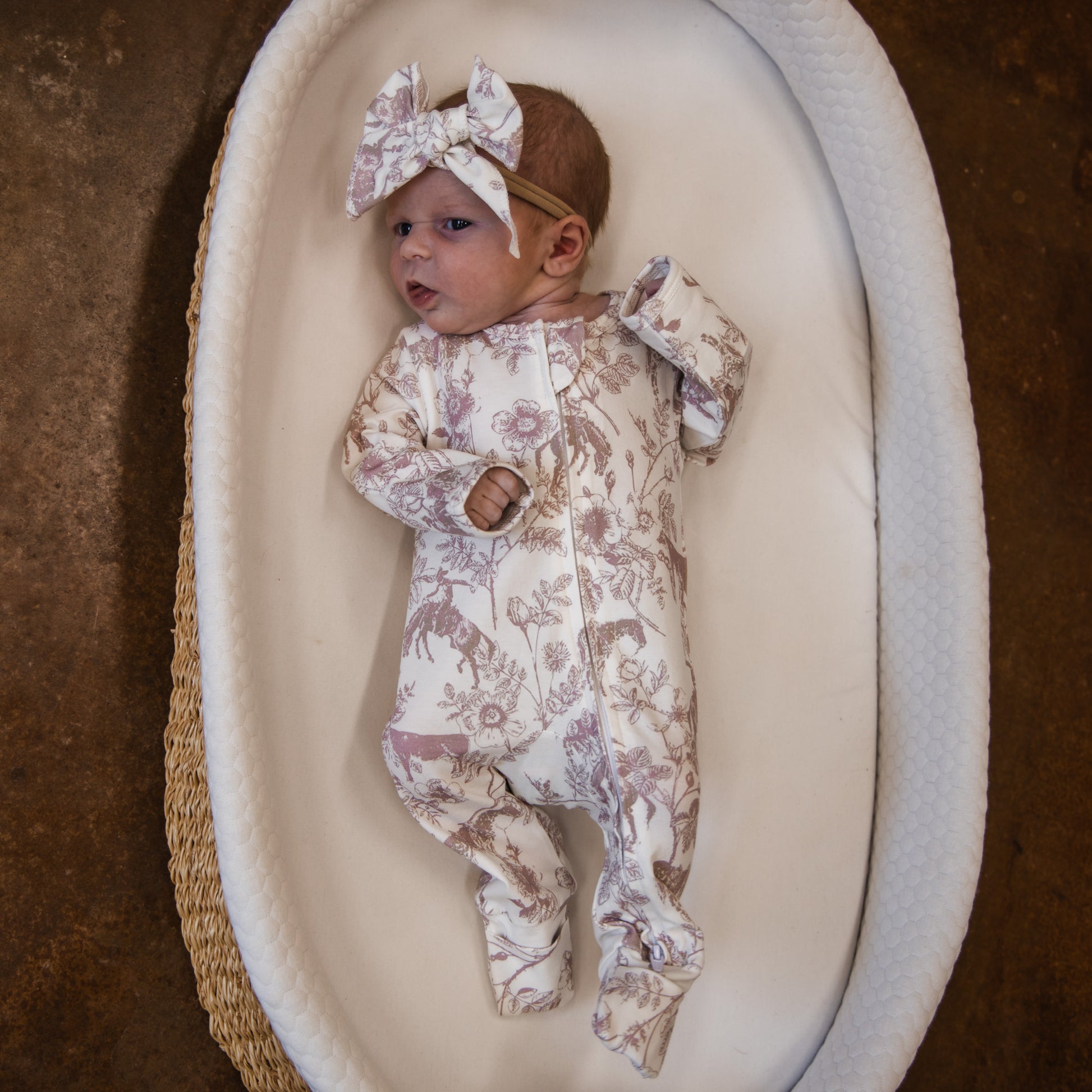 Perfect little headband to match your cute jammies! Made from an incredibly soft cotton/spandex blend and tied in a bow on a nylon stretch band. Fits newborn to about 12 months.